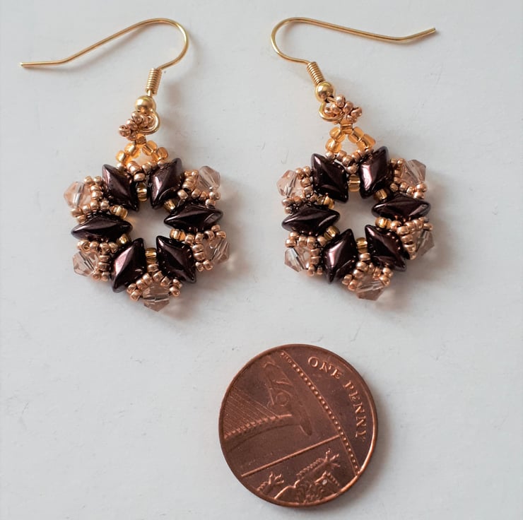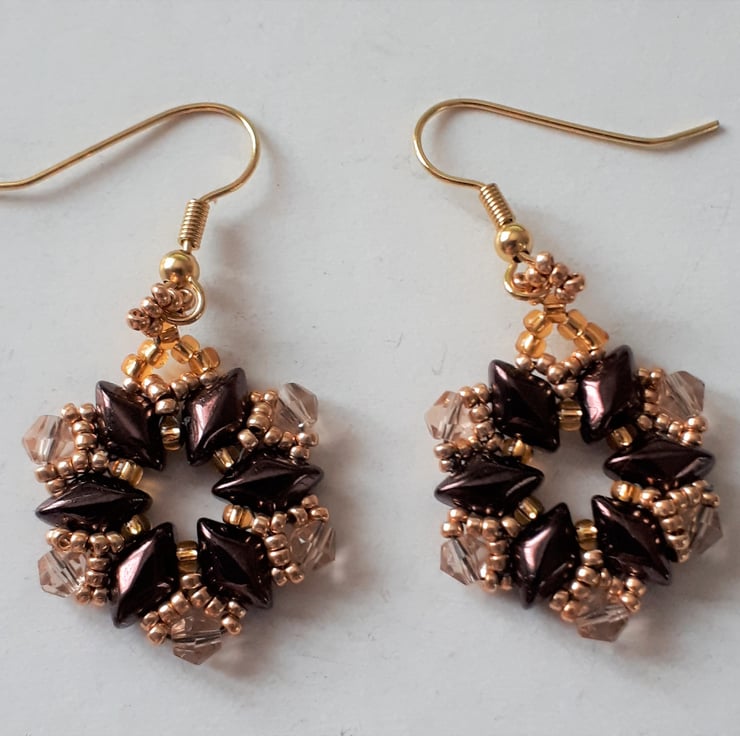 These pretty earrings are made from brown two holed beads, gold metallic seed beads and pale gold bi-cone crystals. They have a subtle sparkle as they move. On gold tone fish hooks for pierced ears. Size approx. .75”/2cm wide with a drop of 1“/2.5cm from the bottom of the hooks. They are light and comfortable to wear.