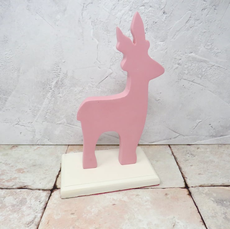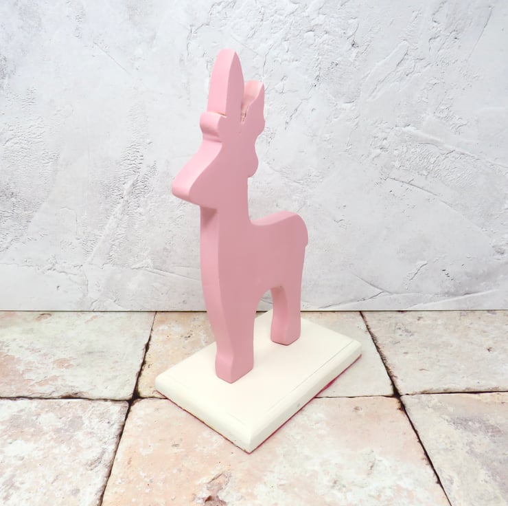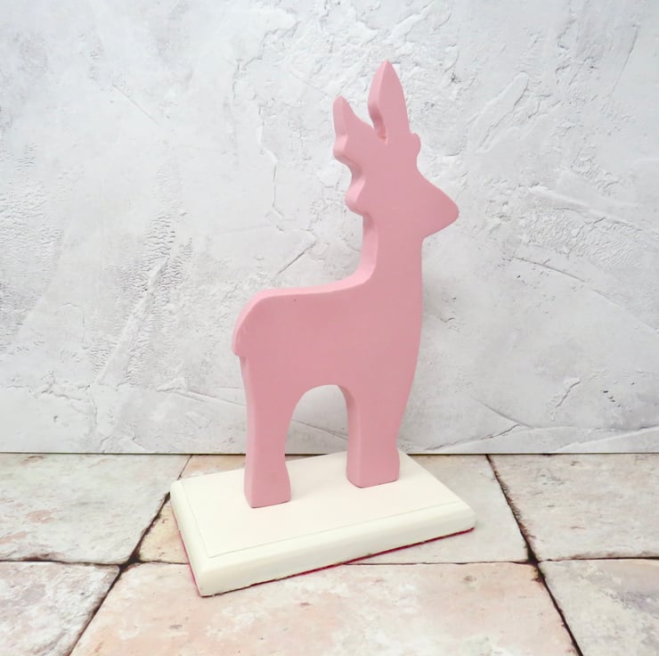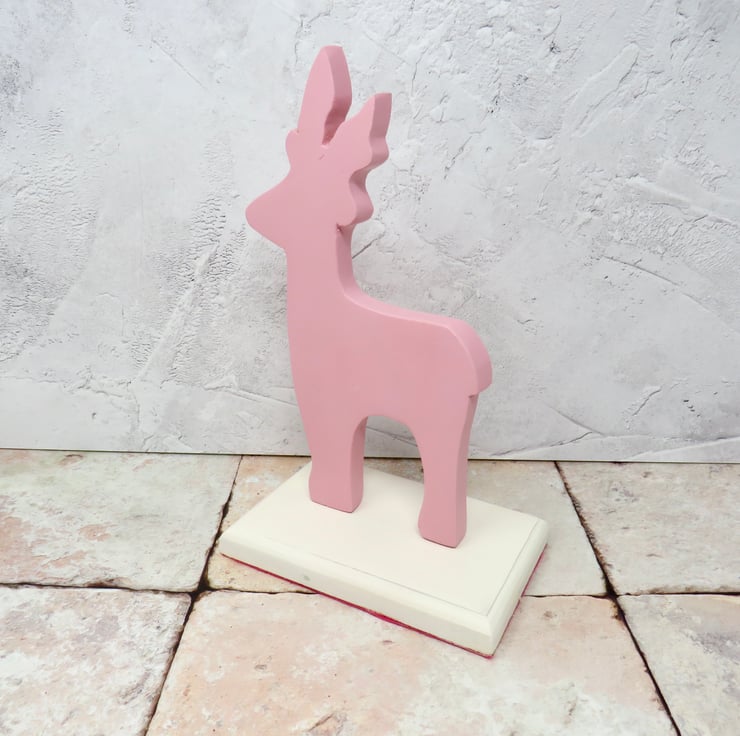 This pink reindeer is painted in two contrasting colours and has felt attached to the base to protect surfaces. It would look perfect alongside your Christmas decoration