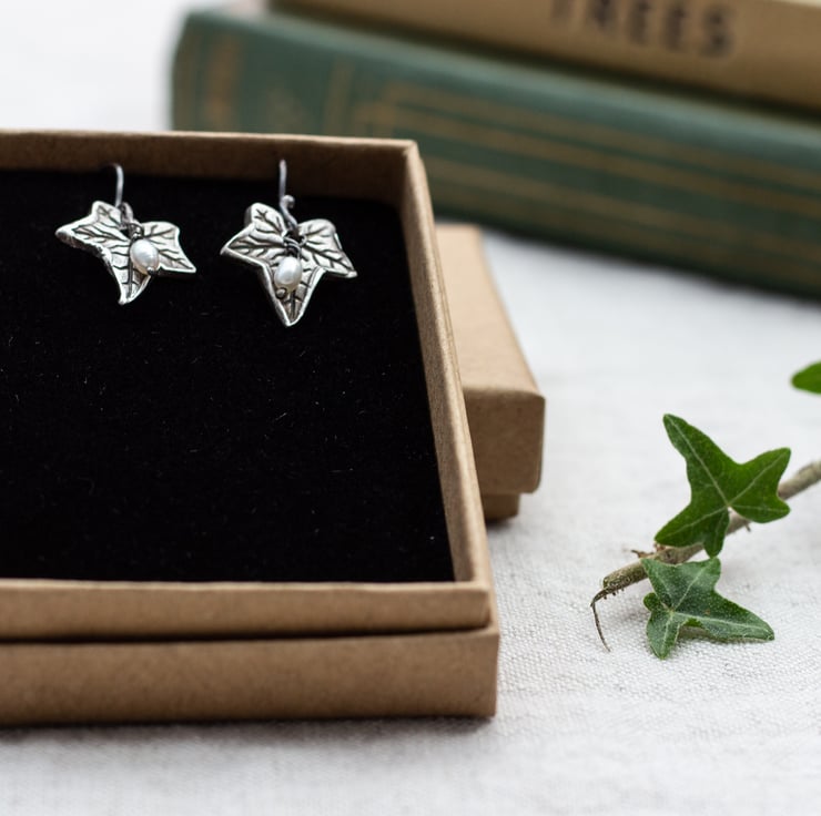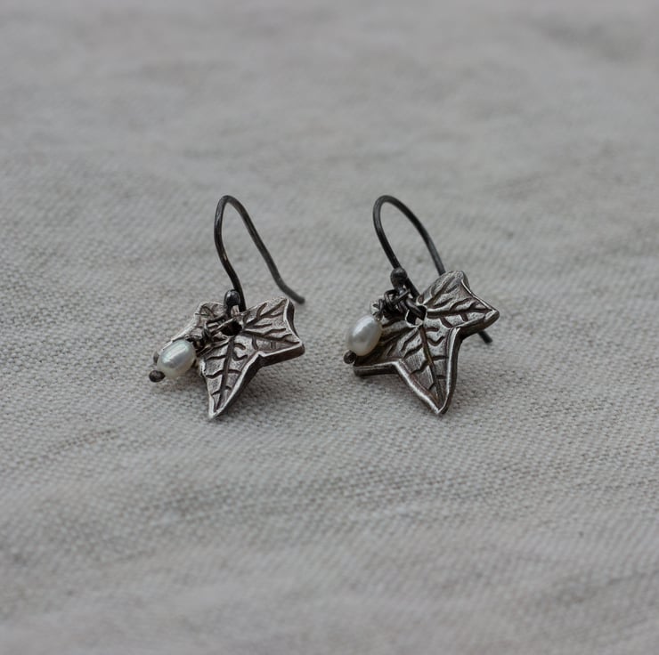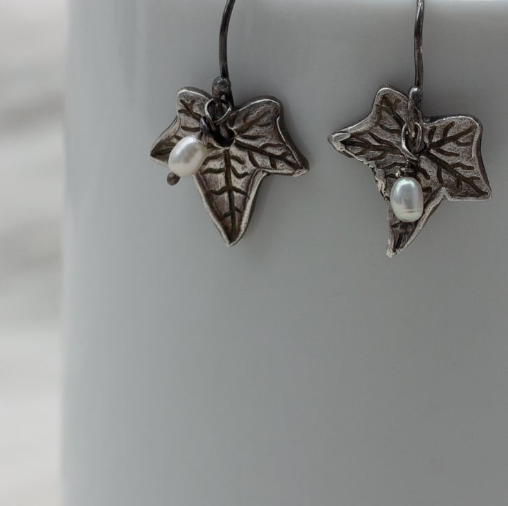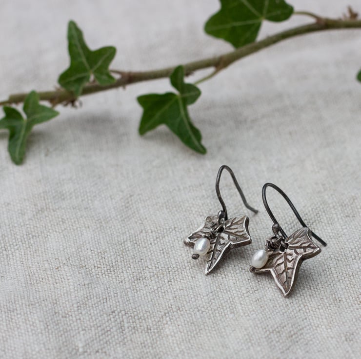 These ivy leaf earrings are made from recycled silver, oxidised for a rustic look, then freshwater pearls are added for a pretty contrast.