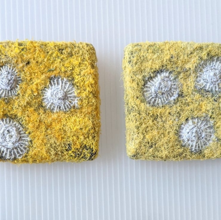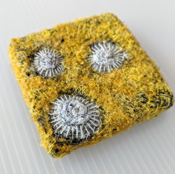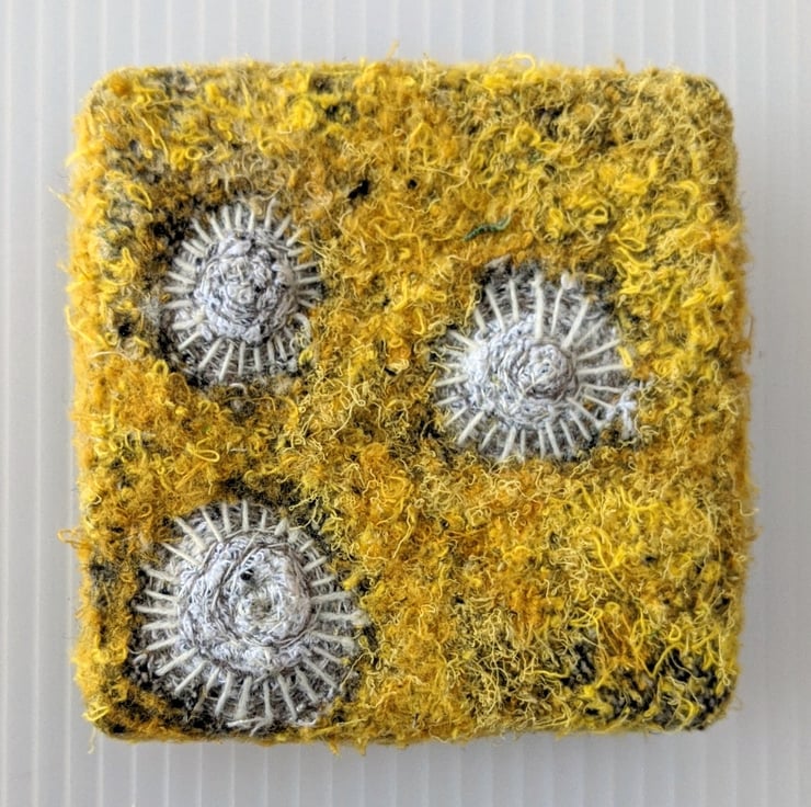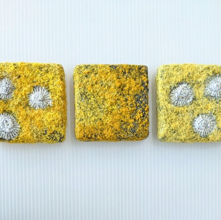 I create coastal inspired textures using a combination of embellishing and embroidery; blending a variety of recycled fabrics to create subtle variations in tone. These are stitched inside waste plastic to cast true to life pieces with cement giving a distinct contrast between the manmade structure of the packaging and the soft natural textures of the textiles.