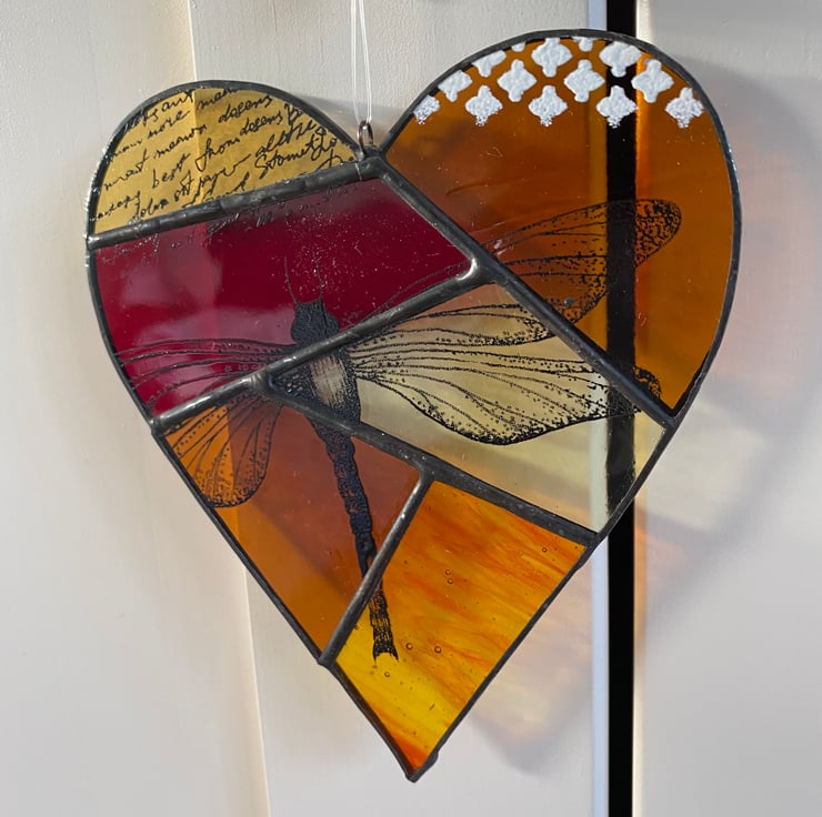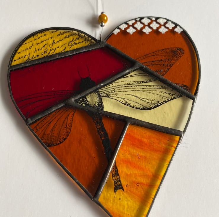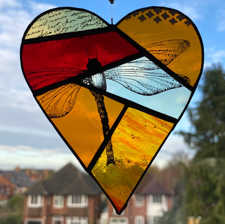 It is comprised of 6 pieces of glass in shades of red, orange and yellow . It has been screen printed with a dragonfly image , text and pattern in enamel and then fired in a kiln .