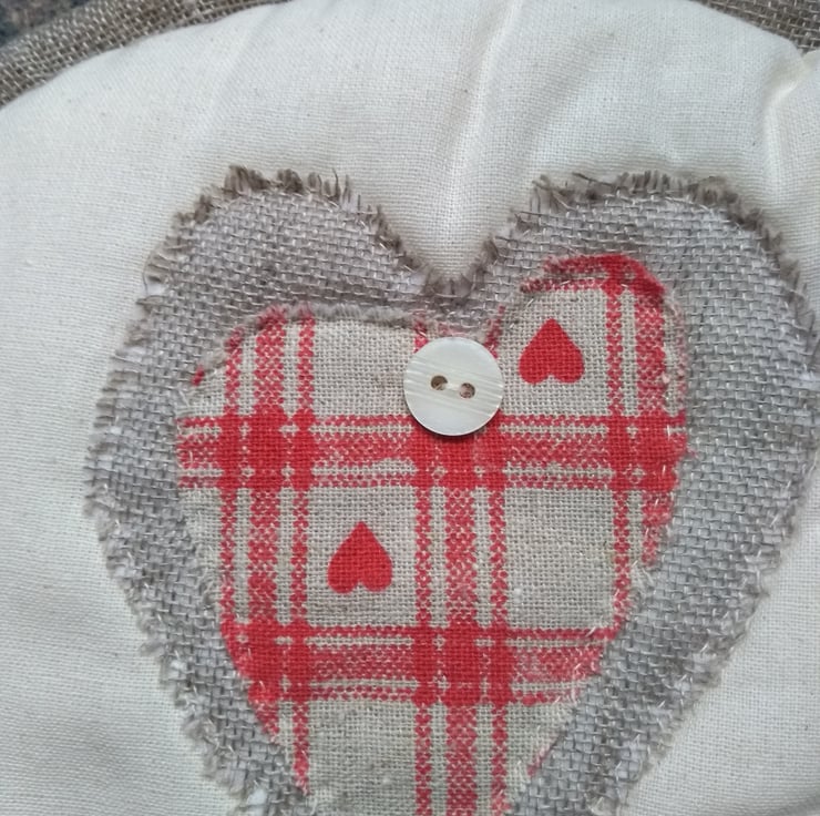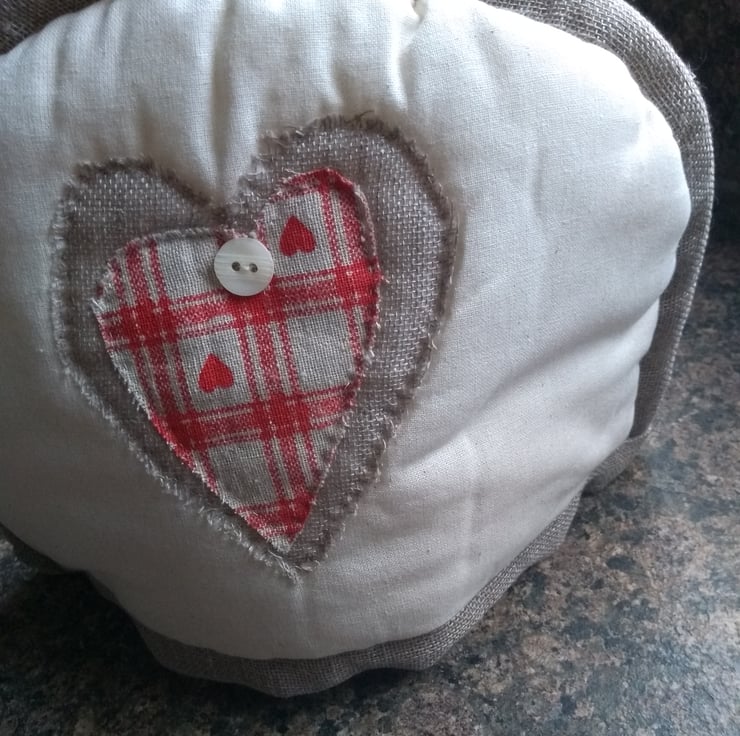 A completely handmade and uniquely designed tea cosy. Consisting of Calico with cotton lining with a polyester wadding filling. Embellished with a heart made from scrim topped with red heart woven Hessian. Finished off with a cream button