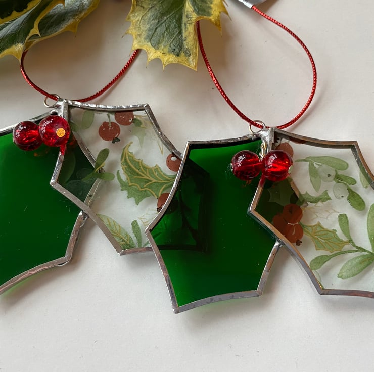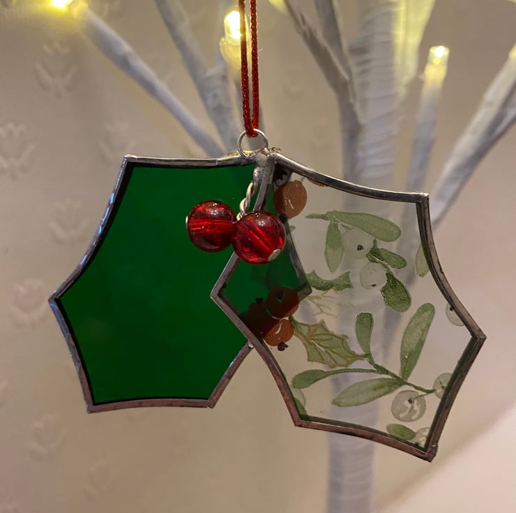 A beautiful stained glass holly made using the Tiffany ( copper foiled ) method of stained glass . There are 2 leaves , one in a green glass and one in a holly and mistletoe patterned glass ( glass may vary slightly) It is finished with 2 red bead berries.
