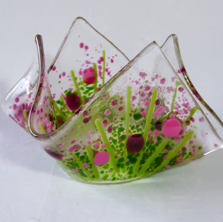 15cm square of glass with a design of a pink flower garden fused into it and then draped over a mould to form a handkerchief style tealight holder.