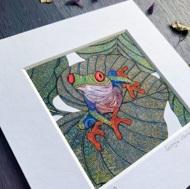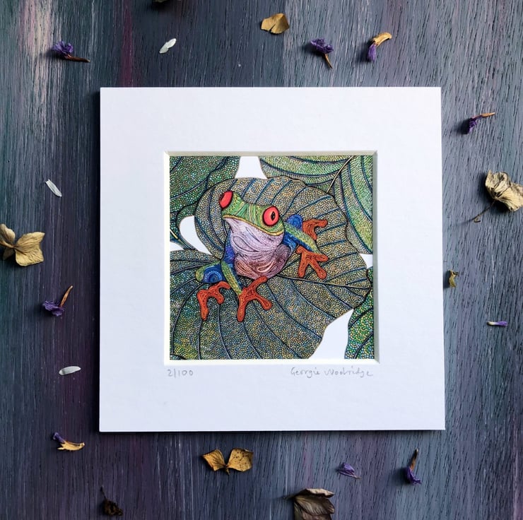 An ice white mounted print of my original artwork, 'Tree Frog'.