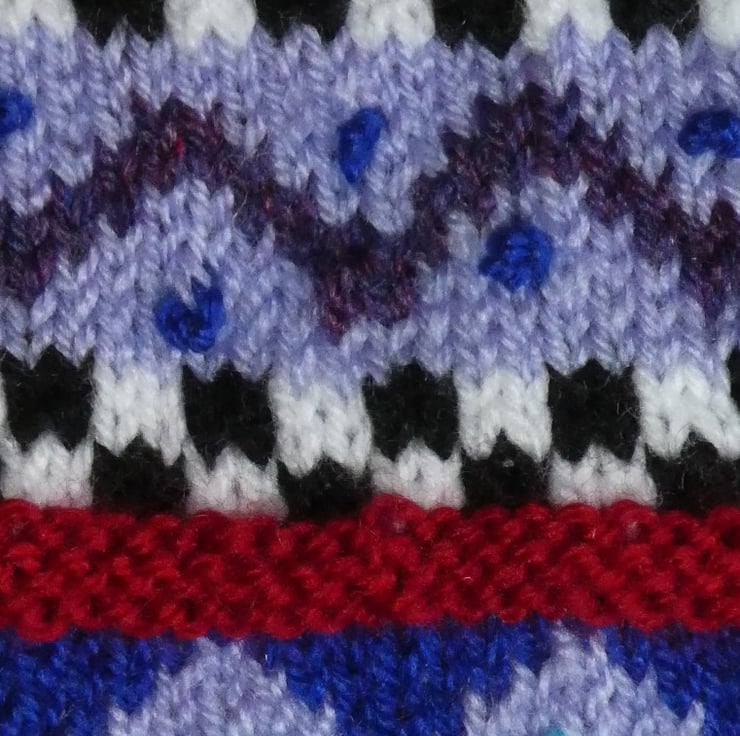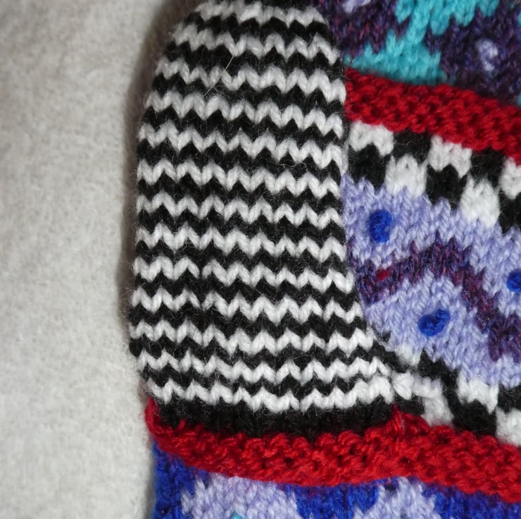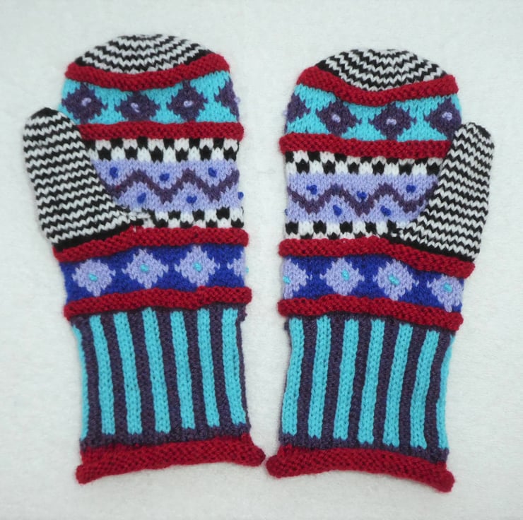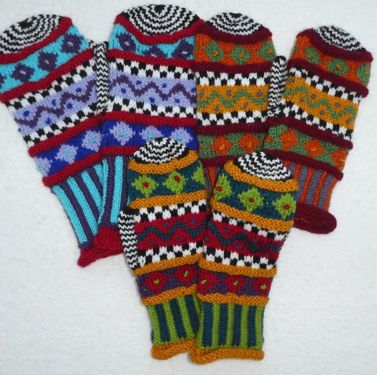 I have designed and hand knit these wonderful brightly coloured mittens from double knitting weight premium acrylic yarn, using fair isle techniques. The mittens have a roll up hem, 2 colour rib, garter ridges and fair isle panels. There are decorative French knots to accentuate the colours and patterns. They are knit in the round, so there are no seams.