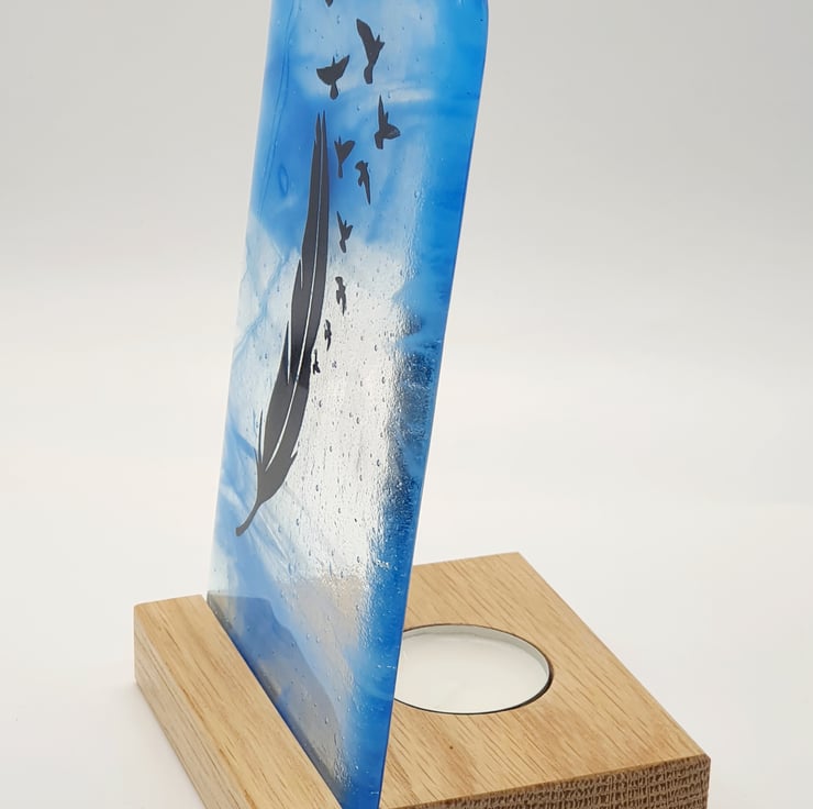 This beautiful blue streaky fused glass panel has been screenprinted with this tranquil picture. It measures 10cm x 17cm and sits in a wooden stand with a tealight holder.