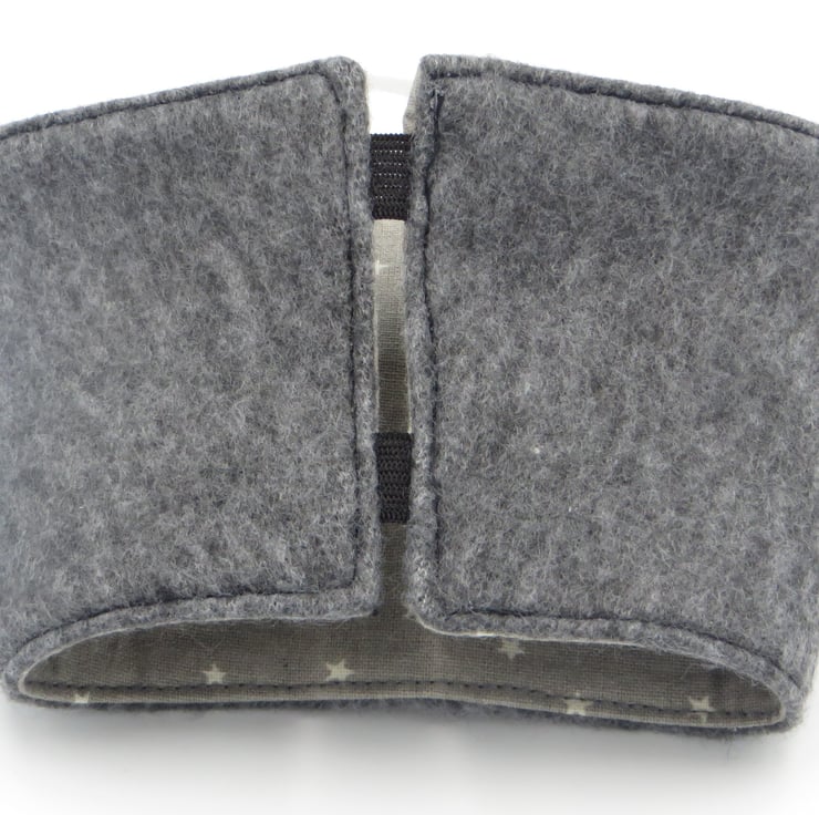 These super 100% cotton fabric cup cosies are lined with grey polyester fleece making it lovely and comfortable and because they are adjustable through the use of fitted elastic with no buttons or tags, they are completely reversible, two for the price of one...double bonus !!
