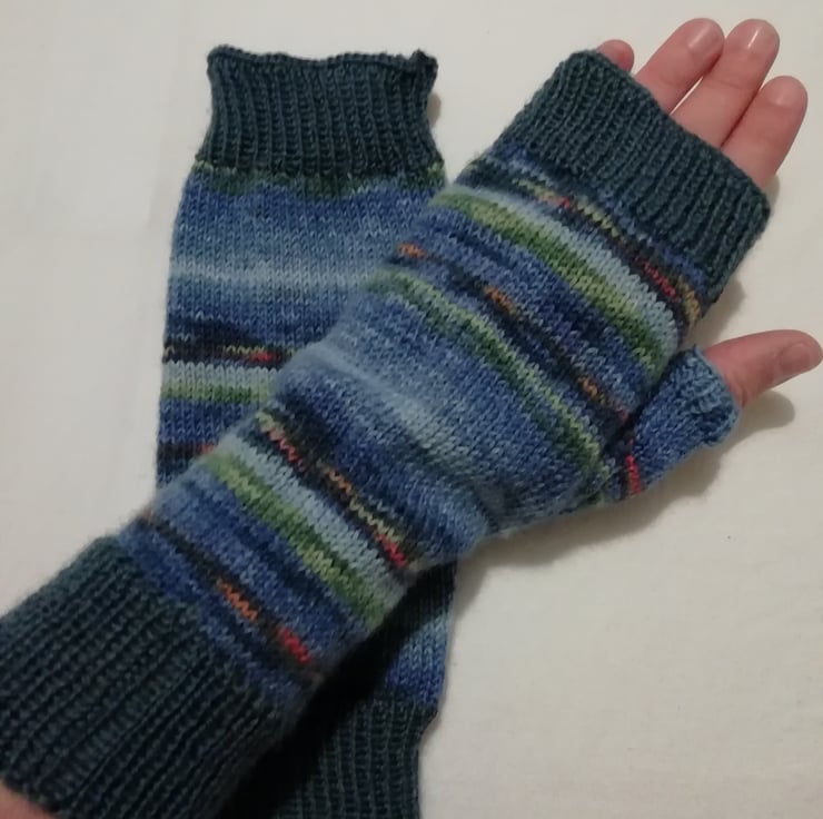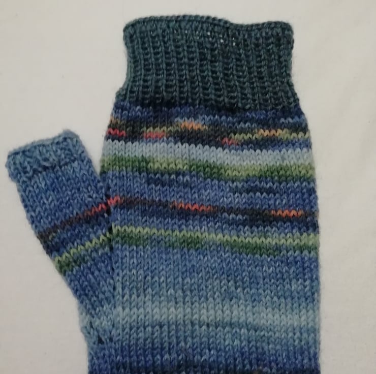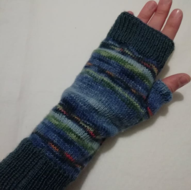 Hand knitted wool fingerless gloves made using a durable and comfortable 4 ply yarn comprising of 75% wool and 25% polyamide ensuring comfort and strength. The colours within the gloves are inspired by Claude Monet's painting, the Water Lilies. Perfect for cooler days, the fingerless design allows you to still get things done without being restricted. This pair of gloves has been knitted in a traditional method using 4 double pointed needles, allowing for a comfortable finish with no bulky seams.