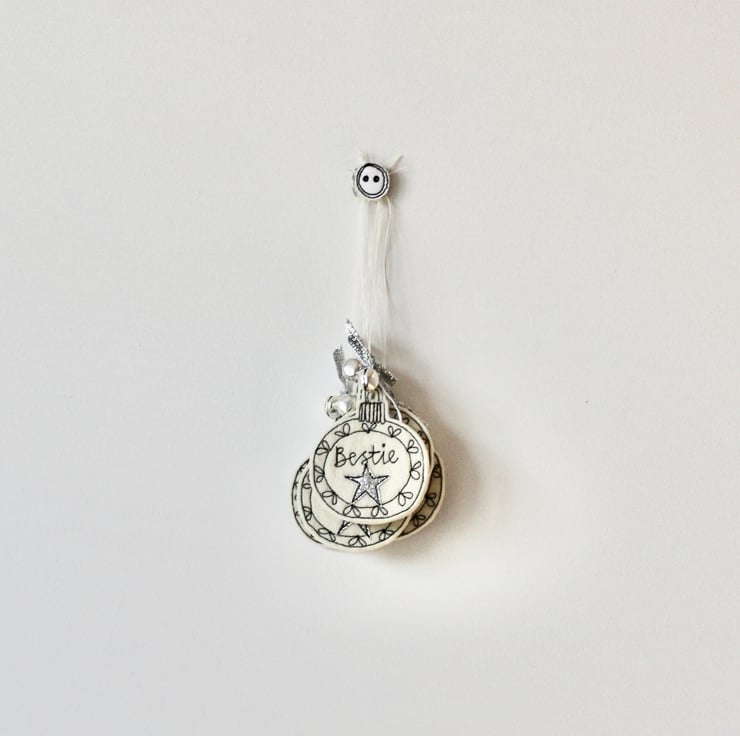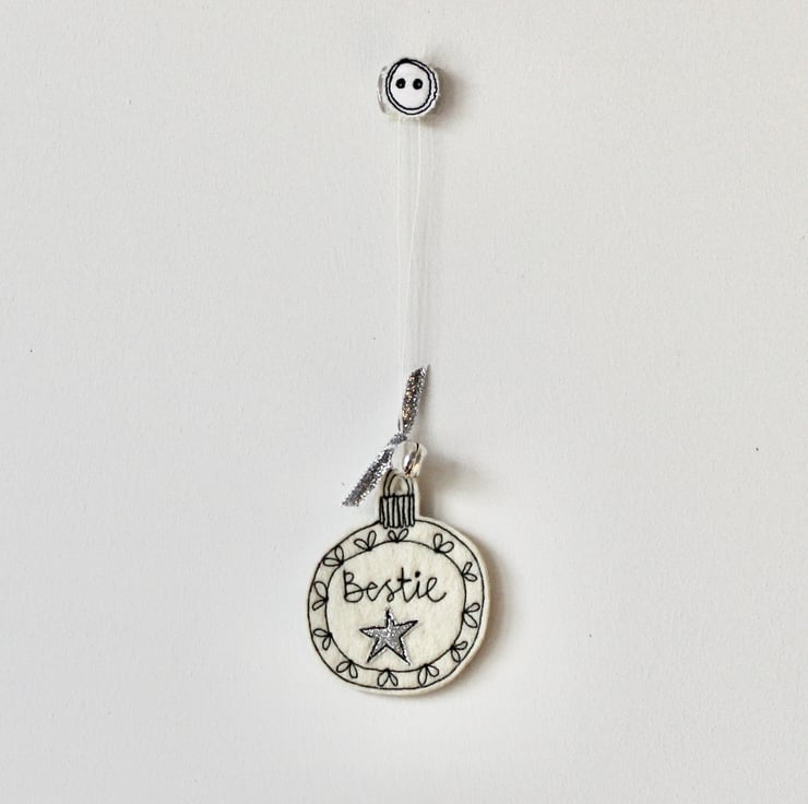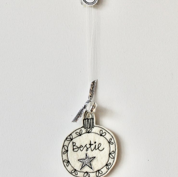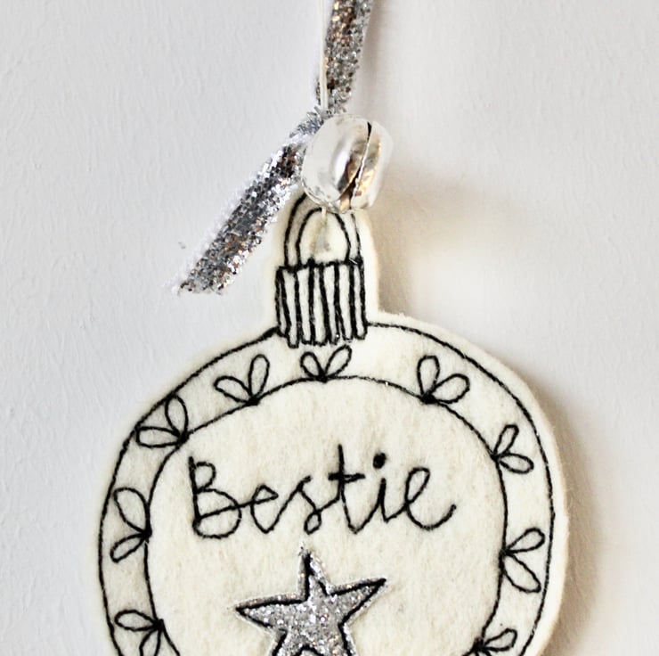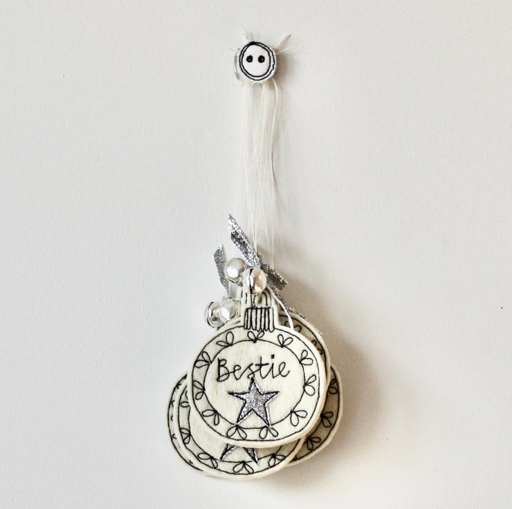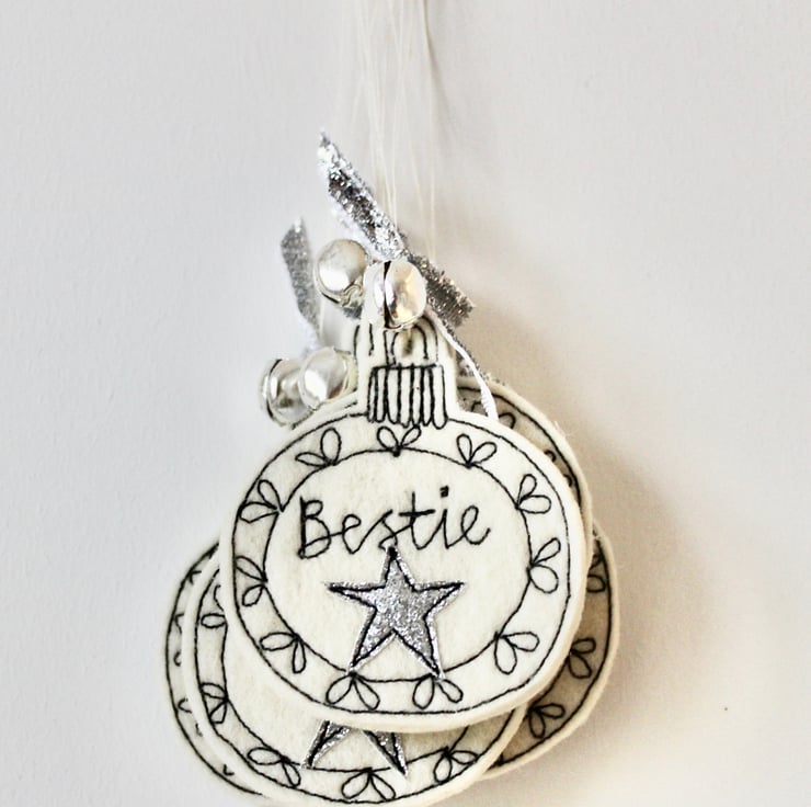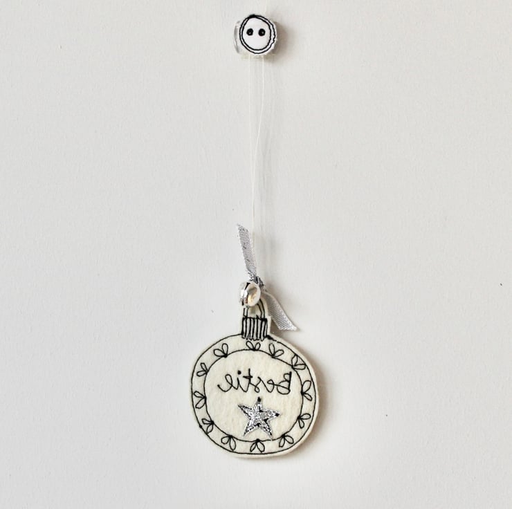 Wool felt baubles are created using 100% cream wool felt, glitter cloth, glitter ribbon, a bell and free hand machine embroidery.