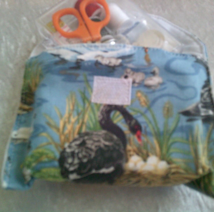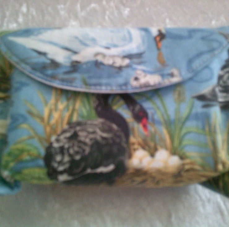The fabric used for the purse features black and white swans and their cygnets on a blue background.