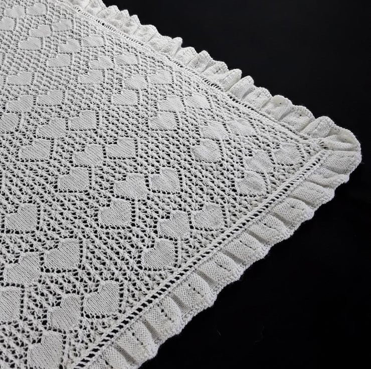 This beautiful baby shawl has been hand knitted using a cream lightweight yarn which has a beautiful drape to it. The shawl has been hand knitted over many hours and features a lacy design with clusters of three hearts and is finished off with knitted border. This sweetheart shawl is perfect for a christening and being cream, it's suitable for boys or girls. . It would make a lovely baby shower gift which can be treasured for years to come and maybe handed down the family.
