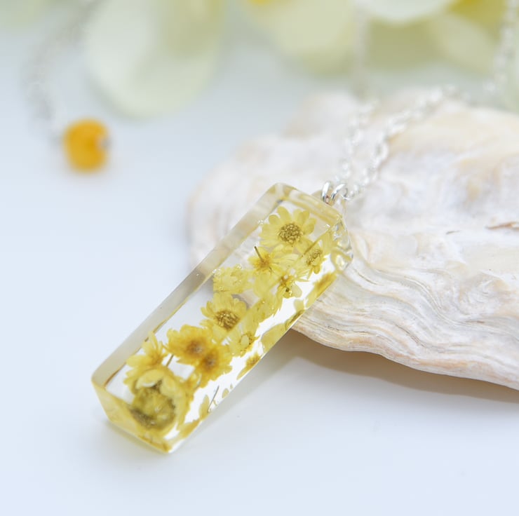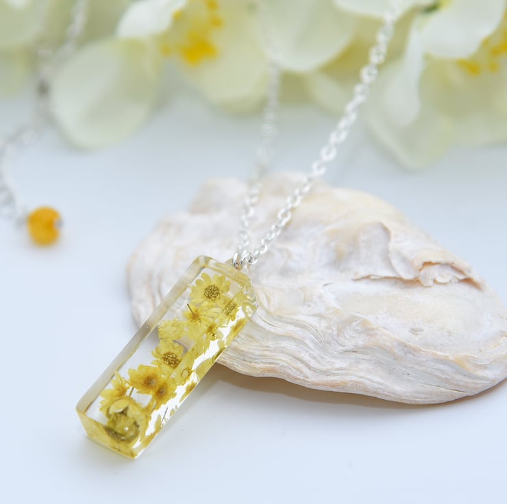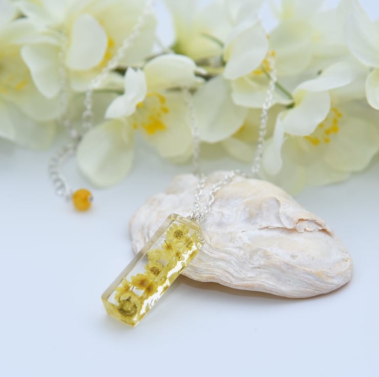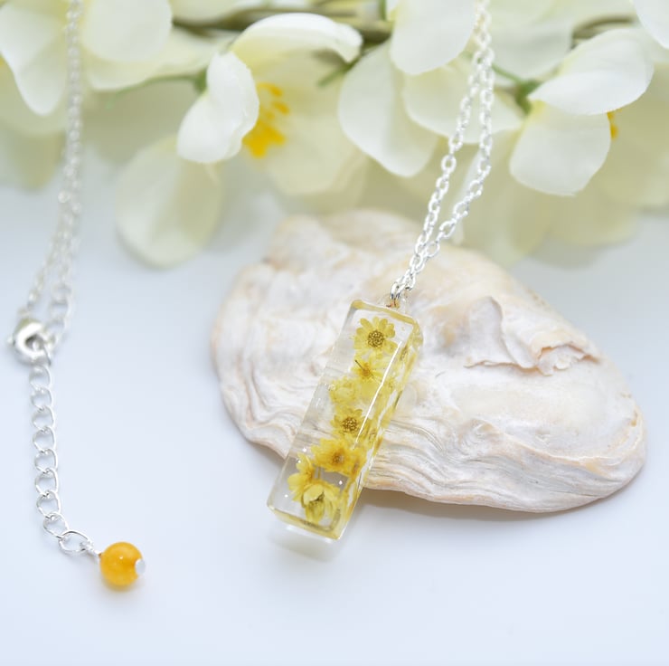 A gorgeous, pendant necklace featuring a rectangular pendant of dried yellow flowers captured inside clear resin, set against silver chain and featuring an agate bead on the end of the extender chain.