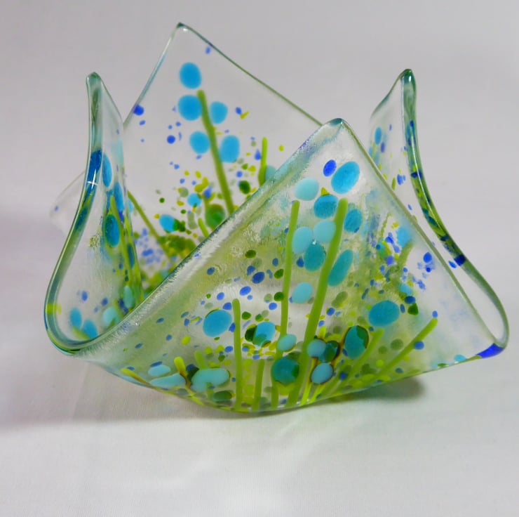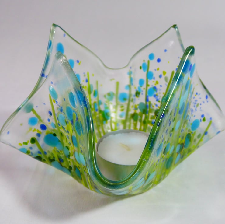 15cm square of glass with a design of a turquoise blue flower garden fused into it and then draped over a mould to form a handkerchief style tealight holder.