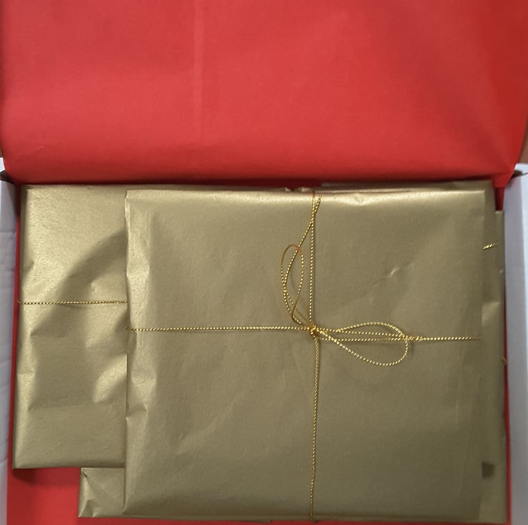 This is a Christmas Gift Box containing three hanging decorations, wrapped and presented in a box.