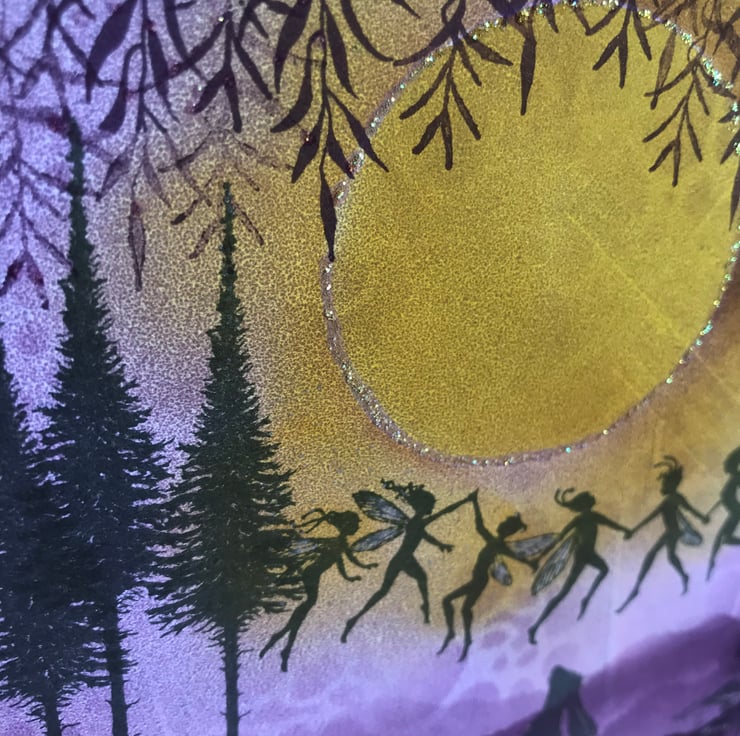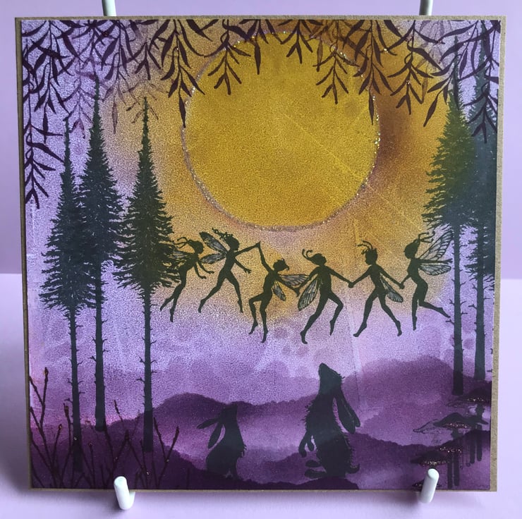 This charming card has been hand stamped with archive ink and the background has been created with Distressed inks therefore no two cards are ever the same. Glitter has been added to enhance the enchanting scene.