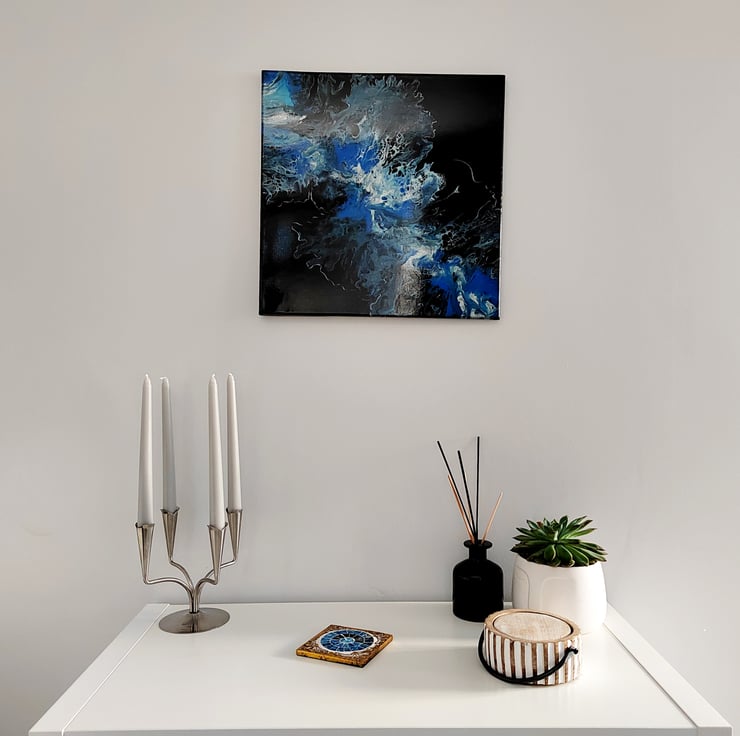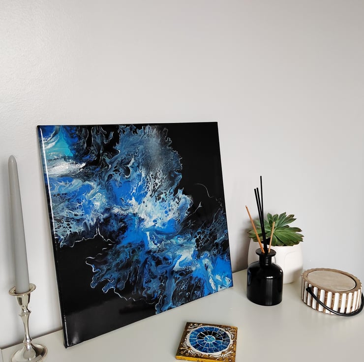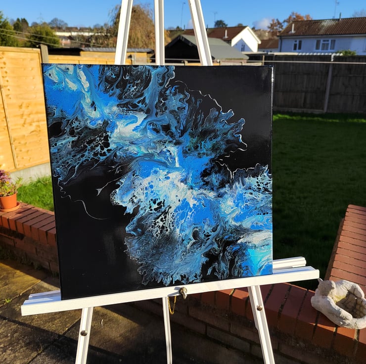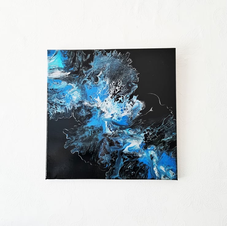 Original 40 x 40cm Blue Acrylic Abstract Wave on Black Background, Abstract Flowers Acrylic Painting Fluid Art - Wall Art, Perfect for Home or Office Decor.