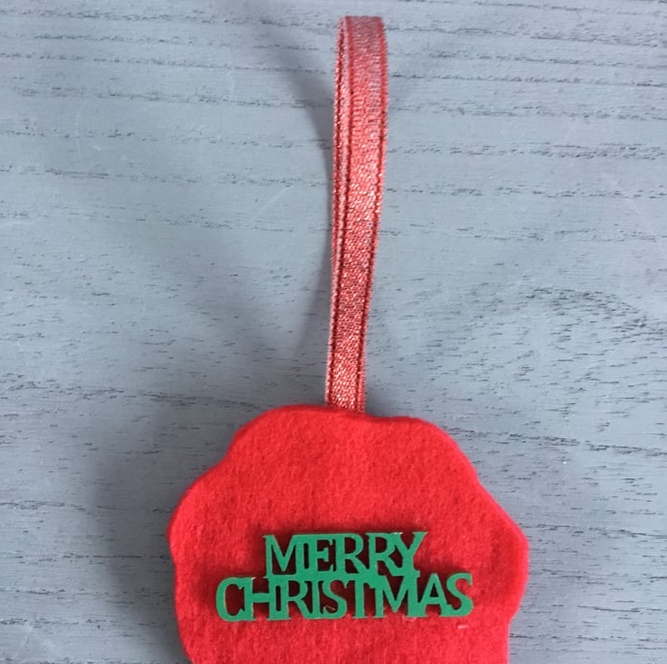 This circular Christmas decoration is 7 cms diameter. It has a large hanging loop in glittering red ribbon. This Christmas Angel Decoration is ready to be hung on a Christmas tree, door handle or picture or, to give as a small gift.....bringing Christmas sparkle into the home.