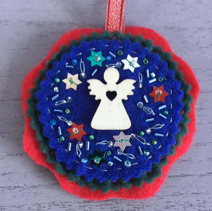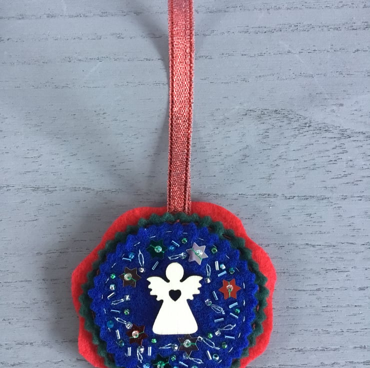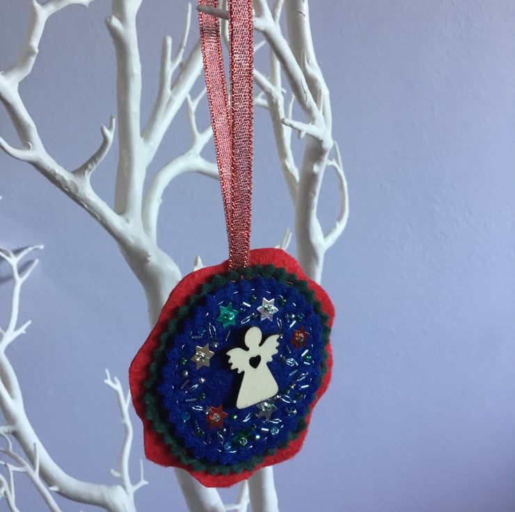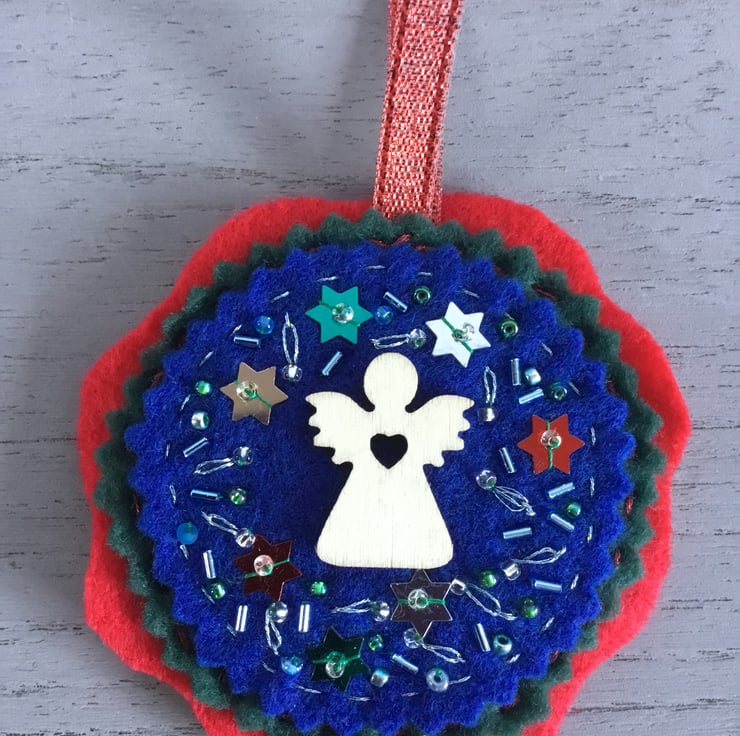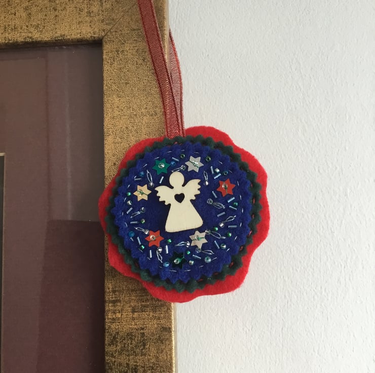 This is a double-sided hanging Christmas decoration in festive Christmas colours of red, green and silver. There is a wooden Angel at the centre of this textile decoration, sitting on a background of red, green and blue felt. Around the Angel is hand embroidered a circle of stitches, beads and sequinned stars..... an Angel in the sparkling Christmas night sky. On the reverse side is a festive message ‘Merry Christmas’.