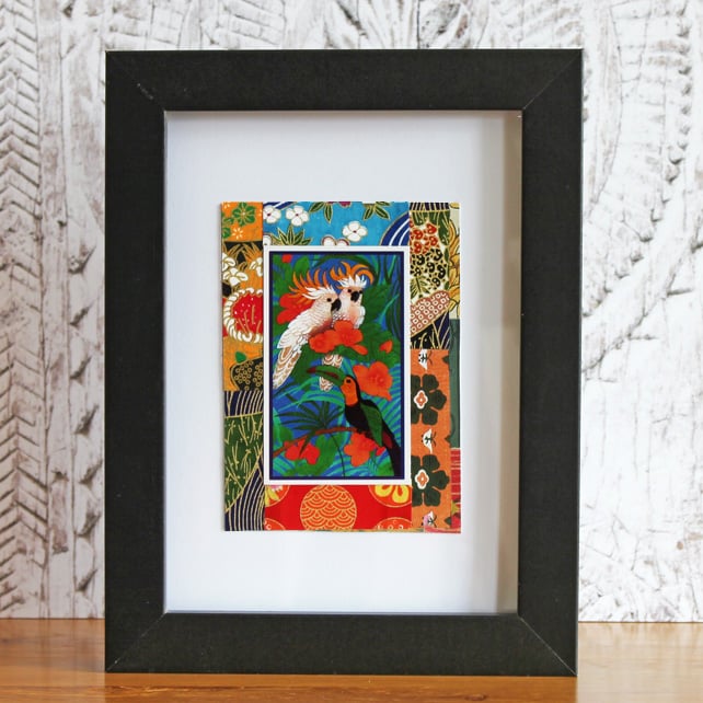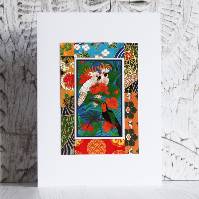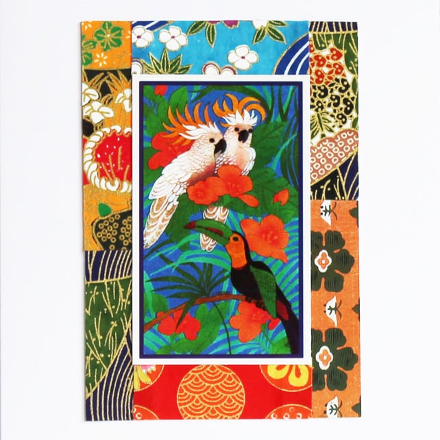 In the centre is a colourful vintage playing card featuring tropical birds and foliage. The rest of the collage is made from Japanese origami papers and patterned papers from old books.