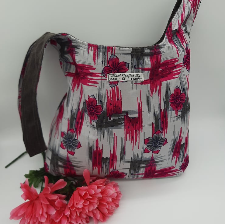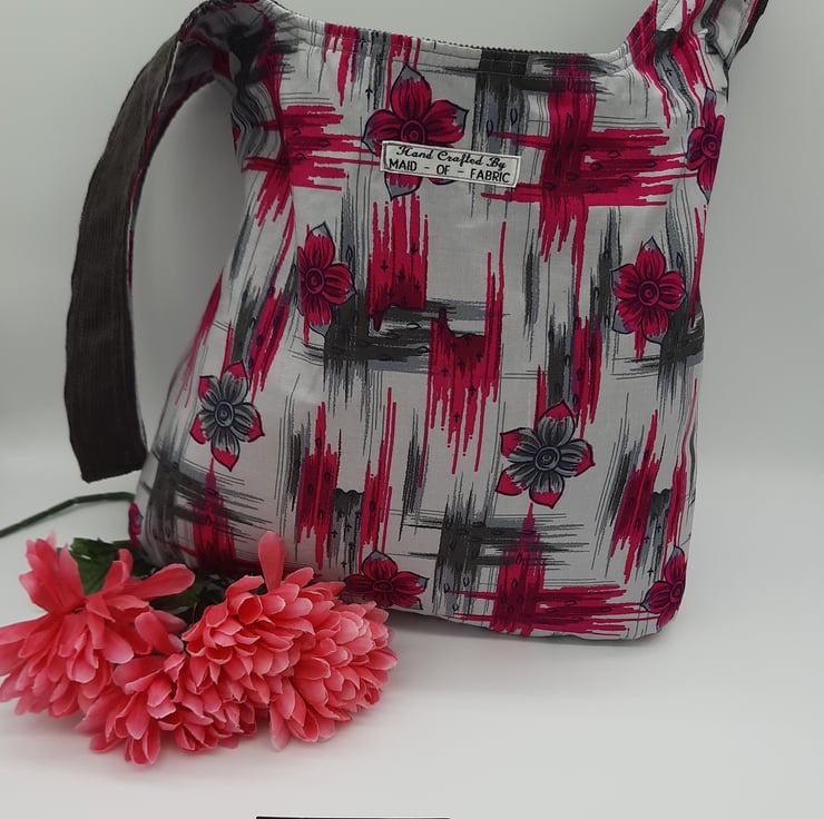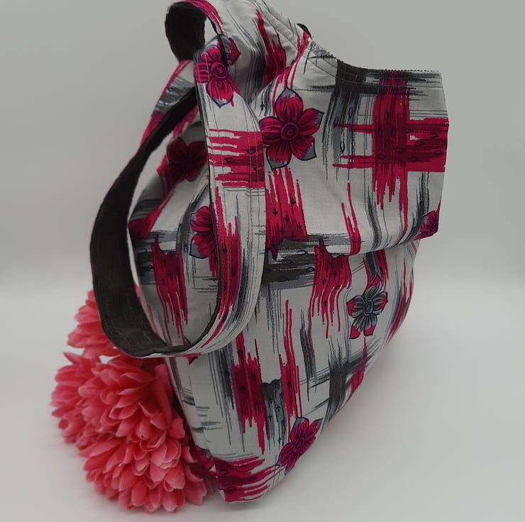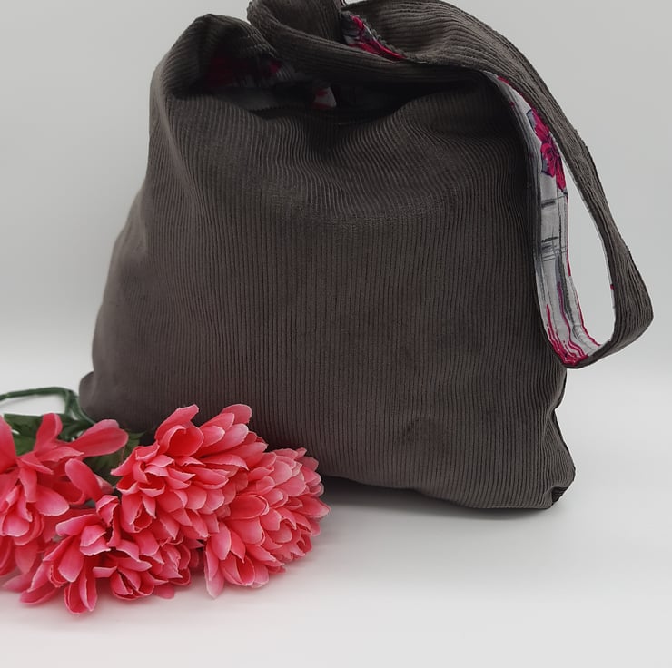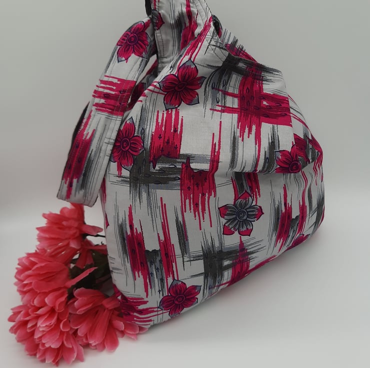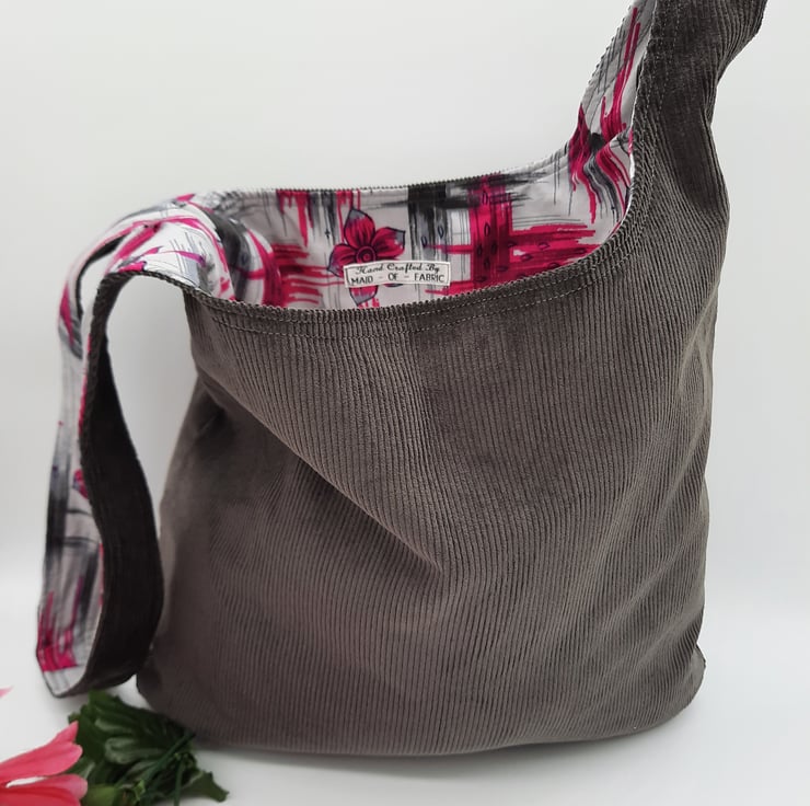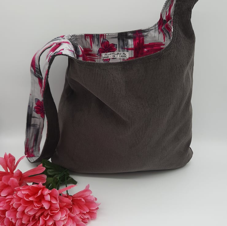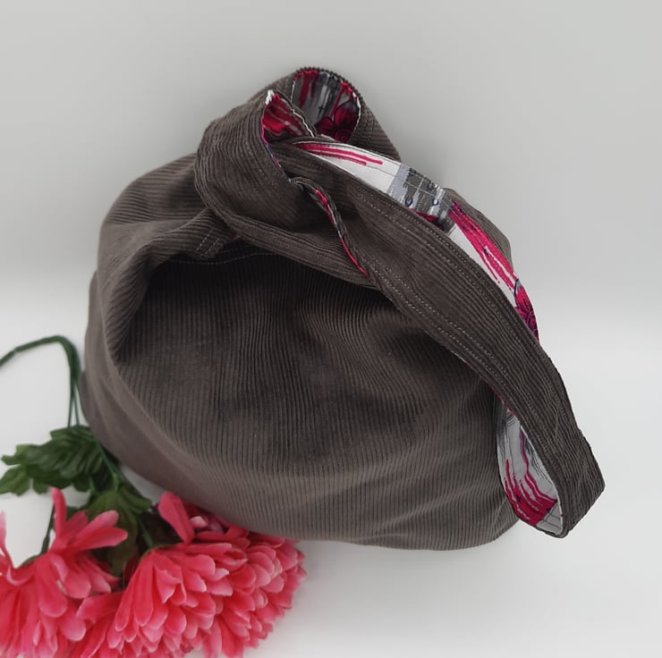 Japanese knot bag made using a grey corduroy and a contrasting light grey and pink pattern cotton fabric.