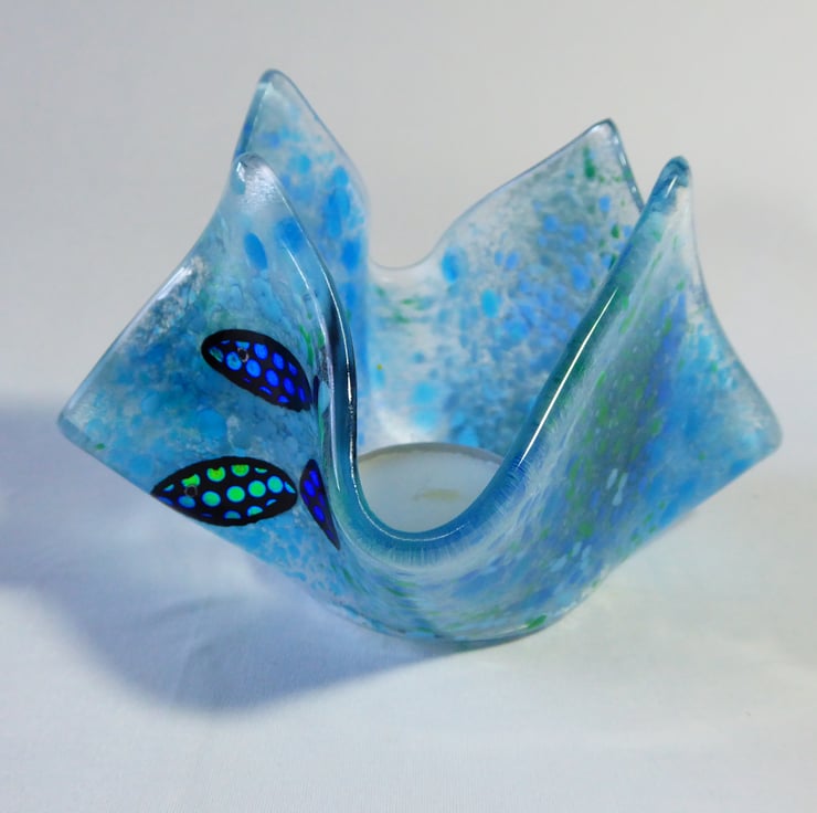 15cm square of glass with a design created from crushed blue glass and 2 fish in dichroic glass and then draped over a mould to form a handkerchief style tealight holder.