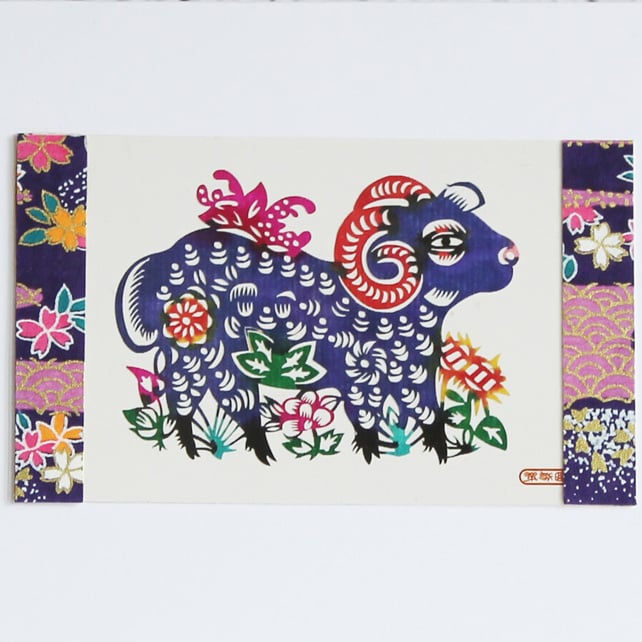 This handmade card features a beautiful Chinese paper cut of a purple goat and flowers.