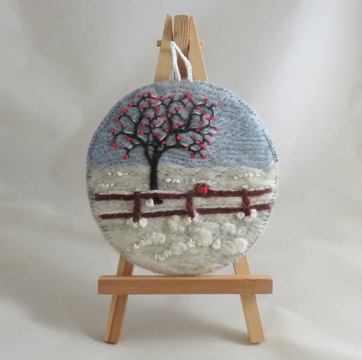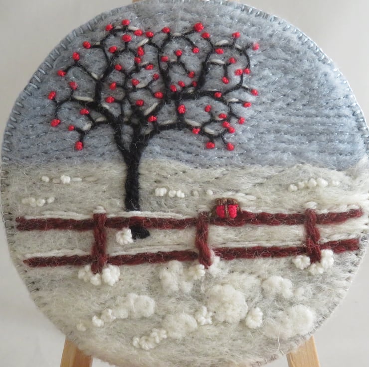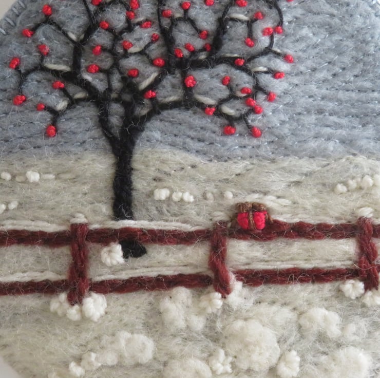 The background of this plaque has been created by felting hand-dyed pale wool fibres into a piece of commercial felt. Details of a winter tree with red berries, fence and the tiny robins have been added in simple embroidery stitches. Drifts of snow have been created by felting 'blobs' blobs of wool fibre in place to represent the larger snow mounds, with snowy white french knots adding to the texture.