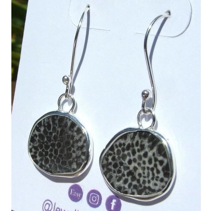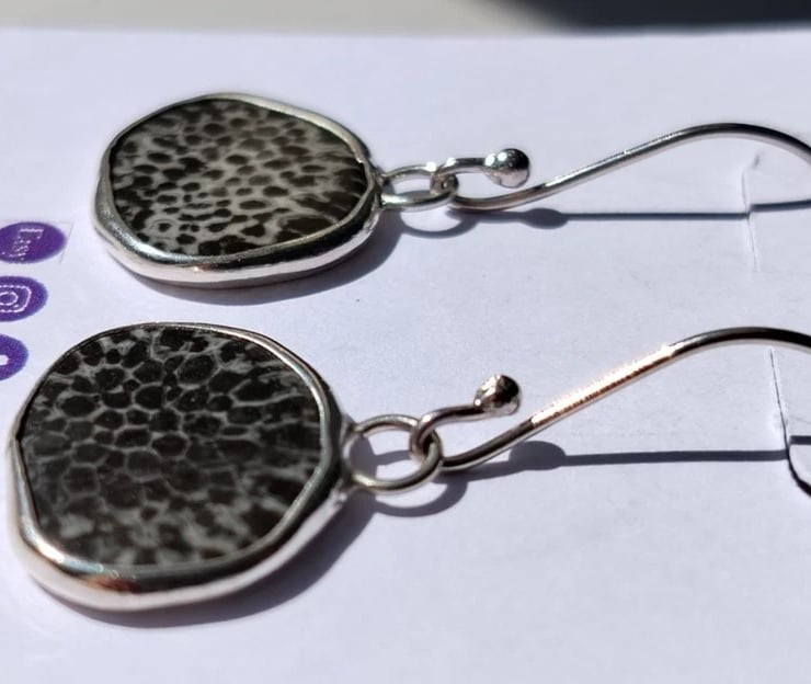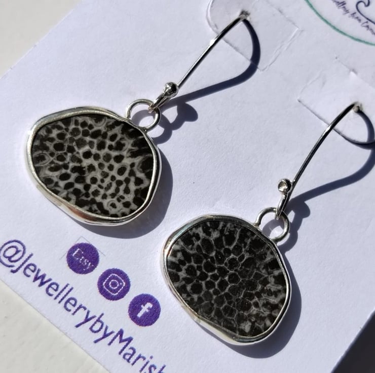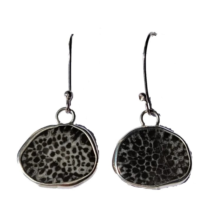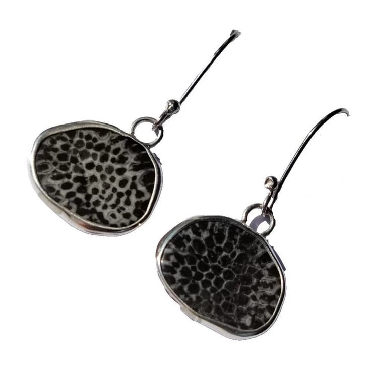 Recycled "Ecosilver" Sterling Silver Handcrafted Earrings with Genuine Black Fossil Coral