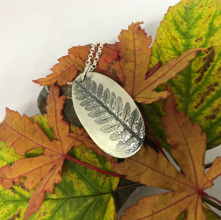 This fine silver pendant is made using silver clay with the imprint pattern of a fern taken from my garden. I have oxidised the pendant to display the fine detail of the fern.
