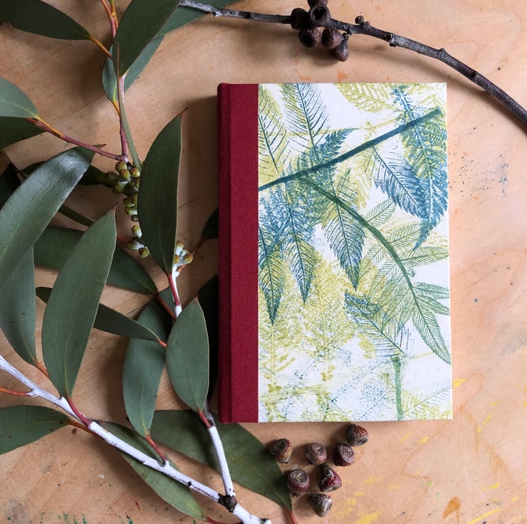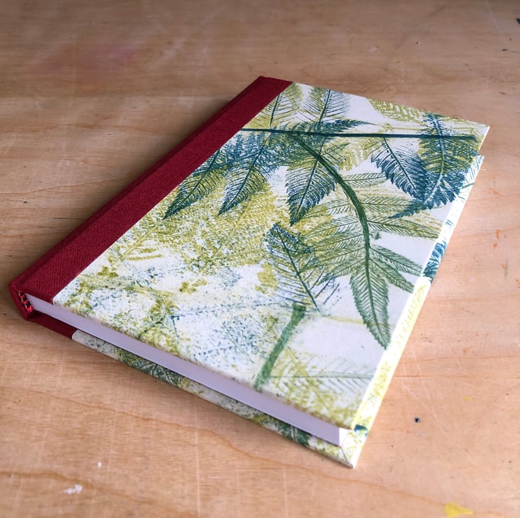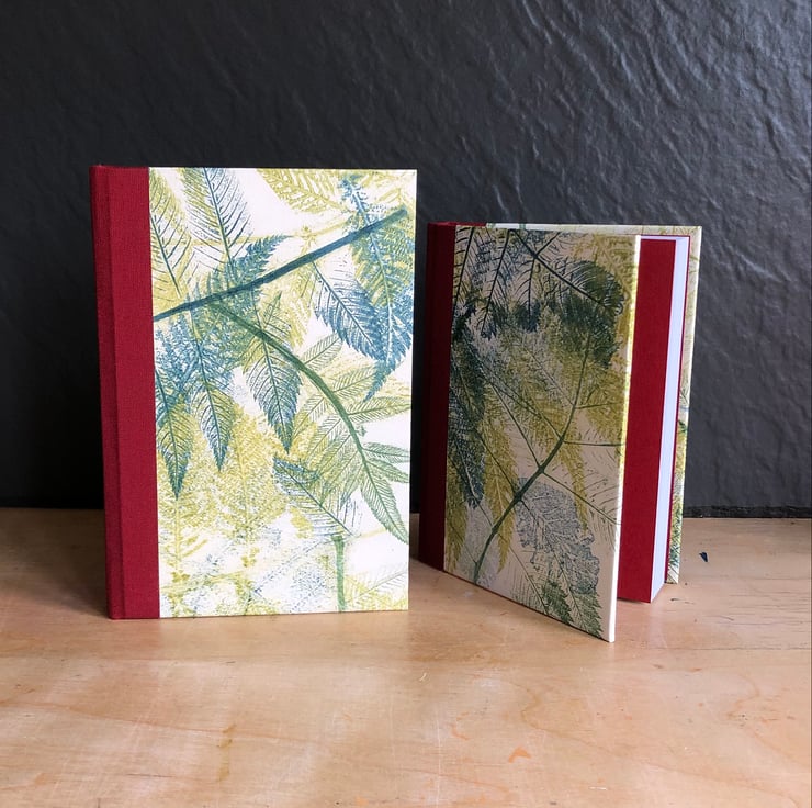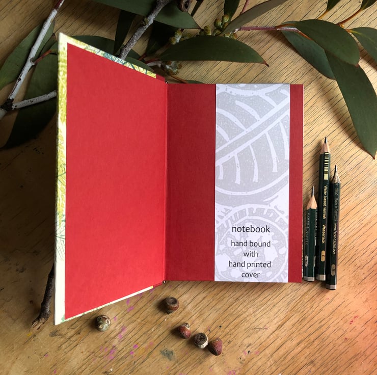 As I hand print all the covers for my hard backed notebooks and hand bind them, each one will be unique.