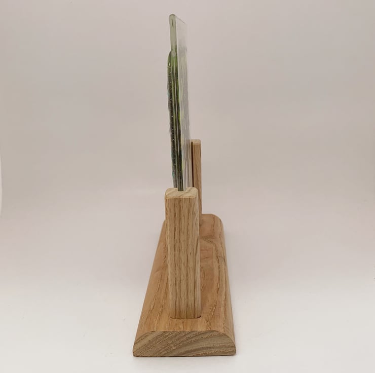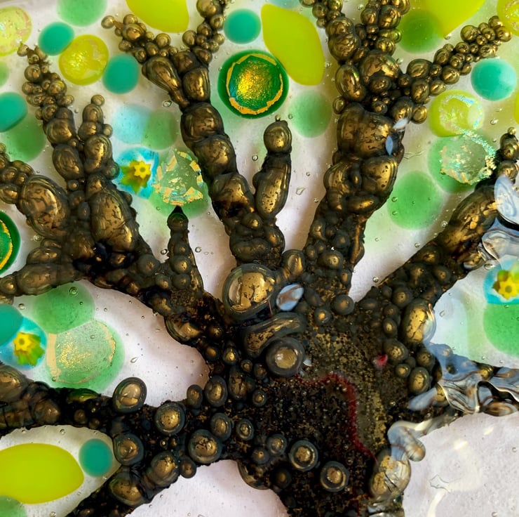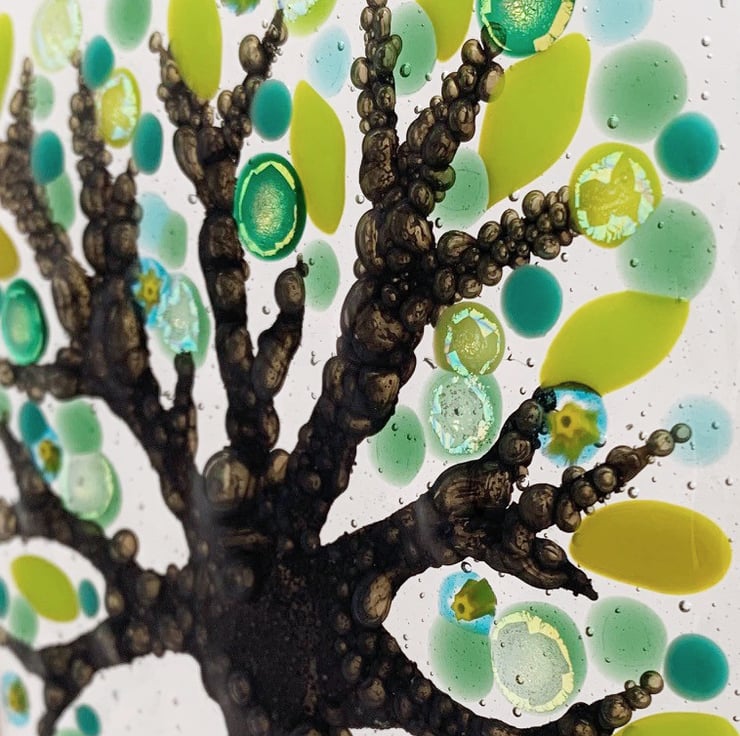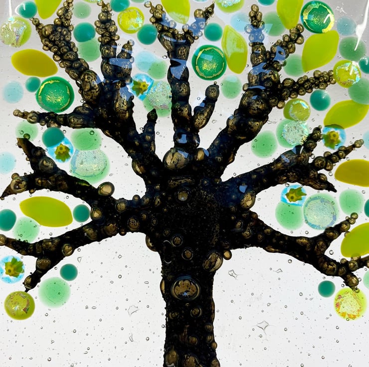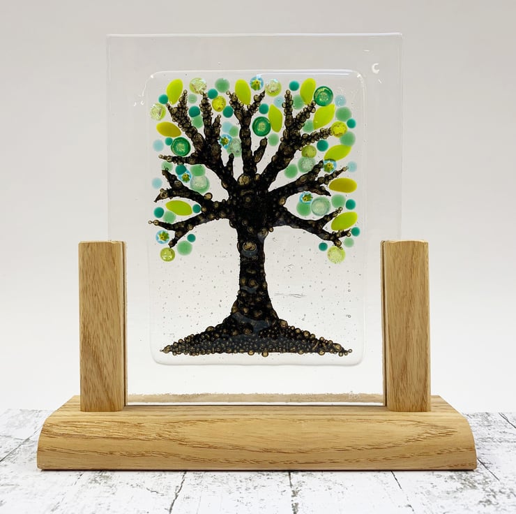 To make it, firstly, I have have hand cut brass sheet into a tree shape. I have then cut 2 rectangles of transparent art glass the same shape and size. l've placed the brass tree in between the 2 layers of transparent glass and fused it slowly overnight. Once completely cooled, I have then added glass leaves and coloured and dichroic dots which I have made previously to give some added detail to the design. A second firing is done overnight the next day to tack fuse the dots onto the design, so that they stand proud of the glass, giving it a 3D effect. I have then fused the whole piece onto a larger sheet of glass. Finally, I have placed the tree panel into an ash wood stand which allows the panel to stand up. The panel is removable for cleaning.