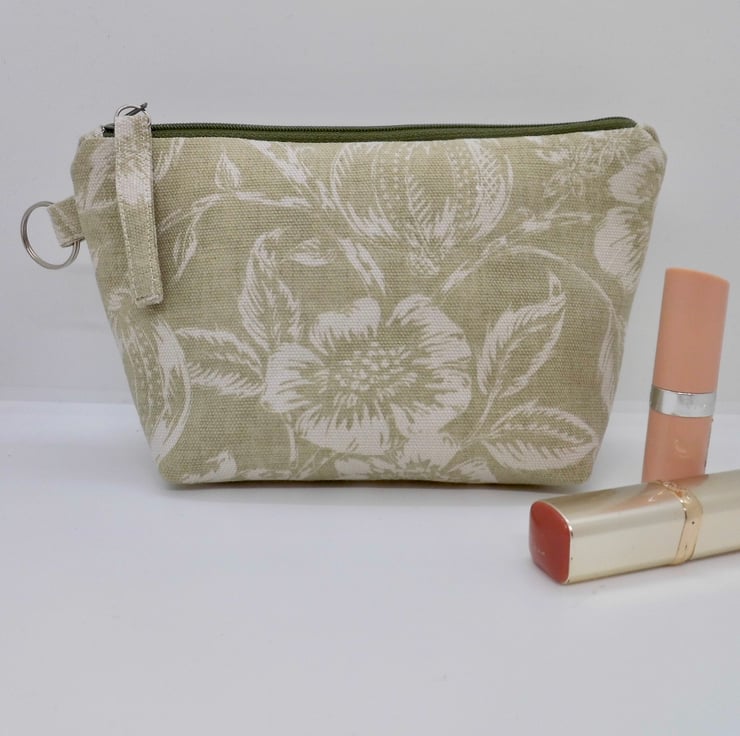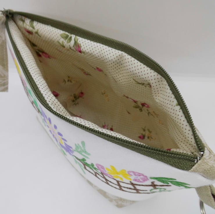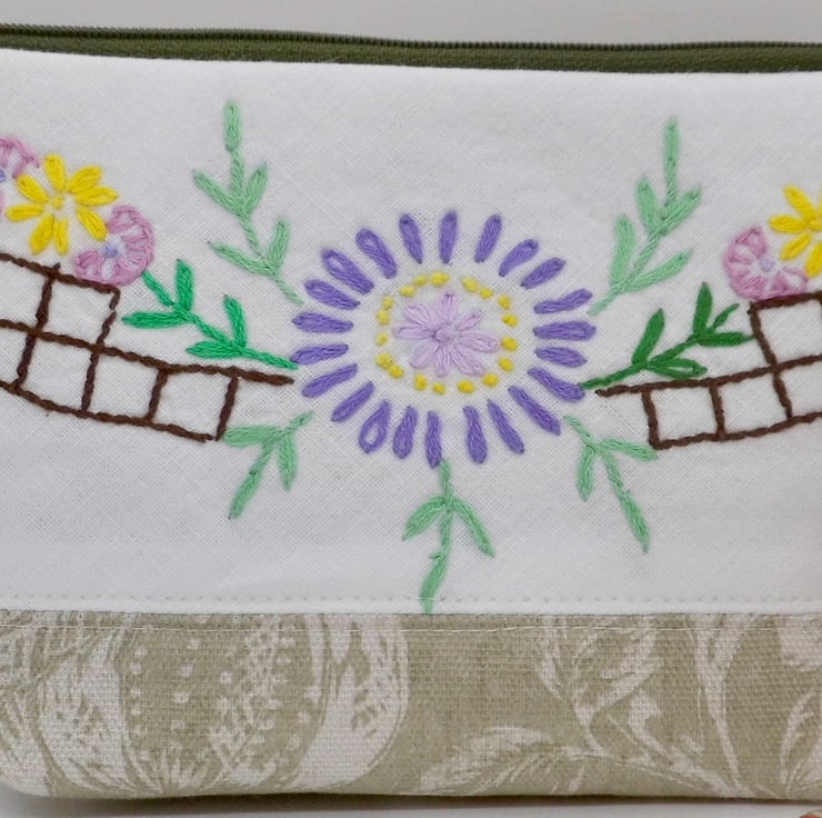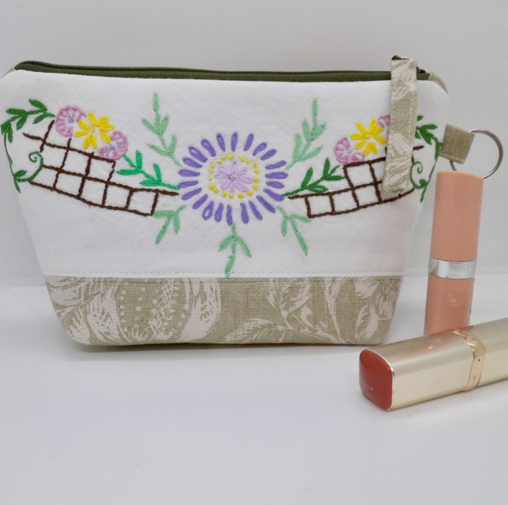 I made this make up bag to showcase a pretty piece of vintage embroidery and paired it with a floral fabric in a soft shade of sage green. All fabric has been backed with fusible interfacing to give it some body and maintain shape. Lined with a dainty floral printed quilting cotton.There is a green zip across the top, finished with a fabric pull.