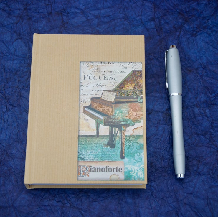A6 Hardback Notebook with kraft paper cover and piano motif.