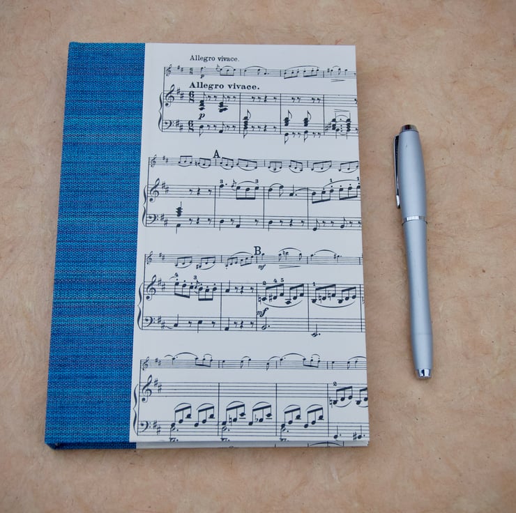A5 hardback lined notebook with blue spine and upcycled music cover.
