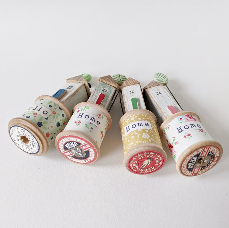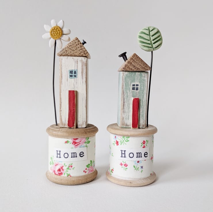 A hand painted little house sits on a vintage wooden bobbin. A little patterned and painted polymer clay tree stands beside it.