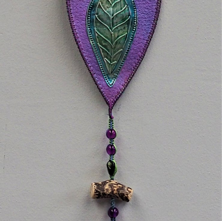 This Goddess Wallhanging is an embossed, dyed metal detail on hand painted (up cycled) leather/suede with macramé, driftwood and beads. It measures 80cm long in total. Stiffened to hold it's shape. Plain black suede on reverse. I made this one with my sister Mandy at Thrifty Drifter, she does the macramé and adds the driftwood and beads. I do the sewing, stitching and the central design.