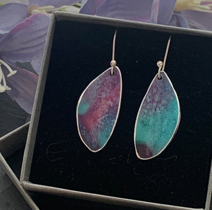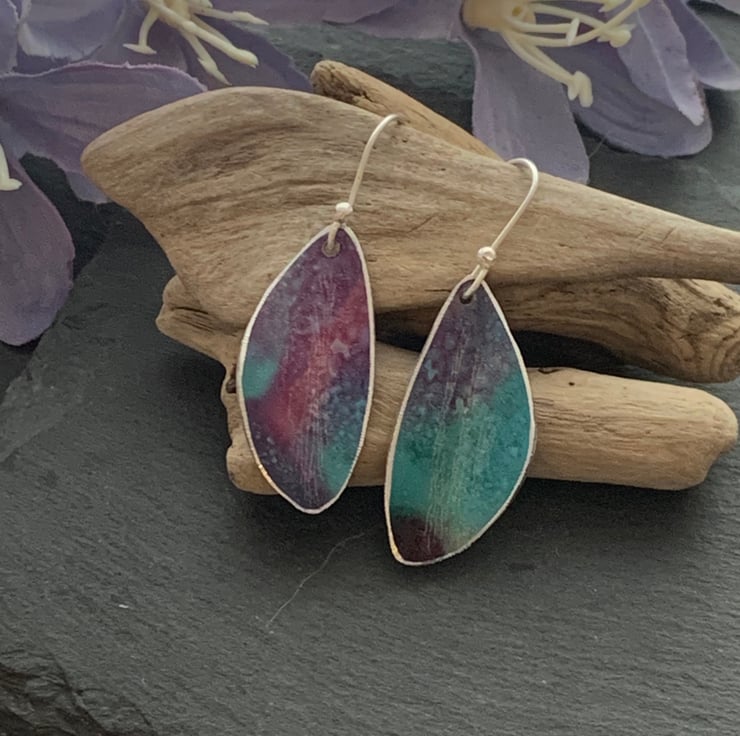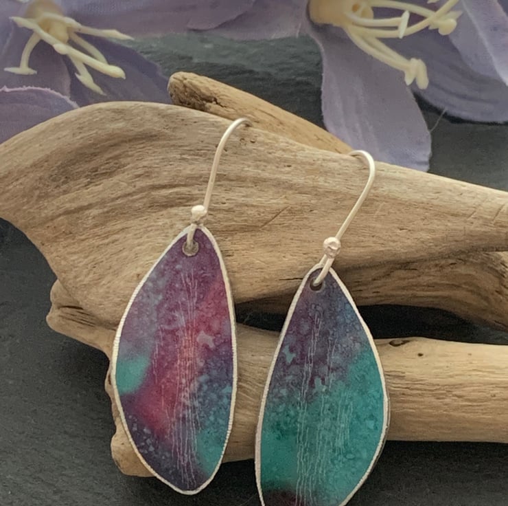 These earrings are made with a hand dyed/printed aluminium. The wing shape drop has been hand pierced/cut and slightly shaped to give it a gentle curve. These have been dyed in a combination of turquoise, purple and pink.