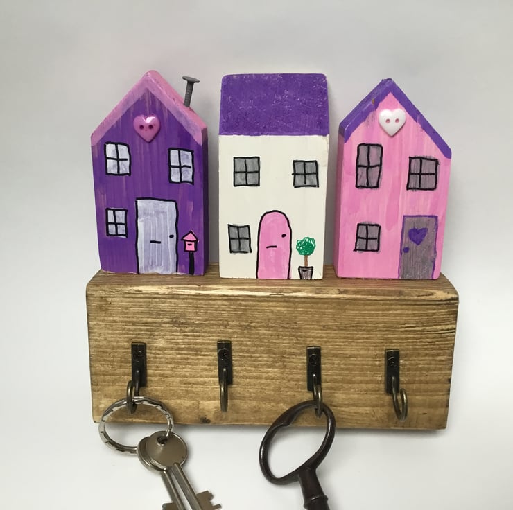 This adorable little lane of wooden cottages is the perfect place to keep your keys safe. Featuring three hand painted cottages mounted on a waxed wooden block, this little lane will be a very attractive addition to your hallway. The four vintage style hooks will safely hold keys, headphones or other little things that get lost on flat surfaces.