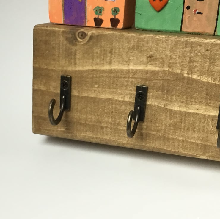 This adorable little lane of wooden cottages is the perfect place to keep your keys safe. Featuring three hand painted cottages mounted on a waxed wooden block, this little lane will be a very attractive addition to your hallway. The four vintage style hooks will safely hold keys, headphones or other little things that get lost on flat surfaces.