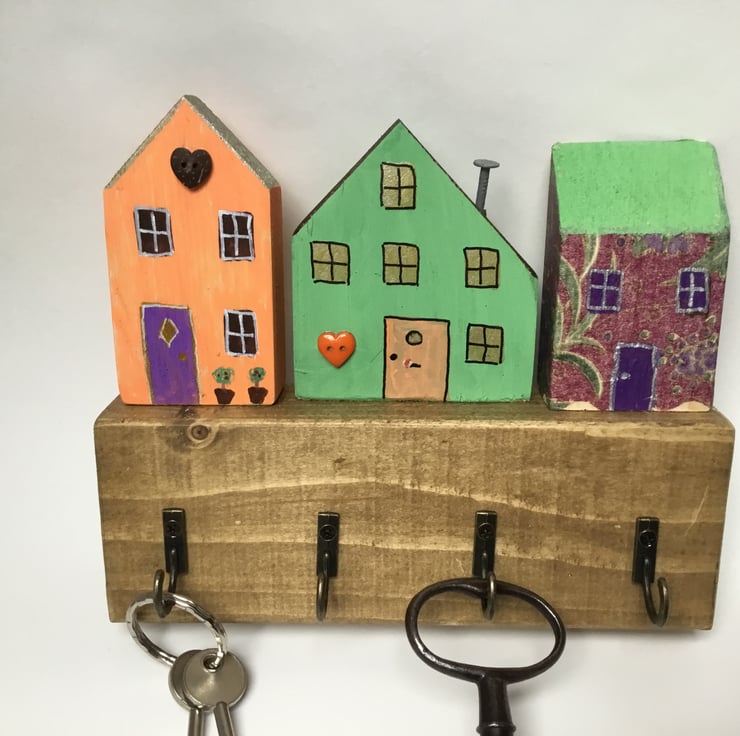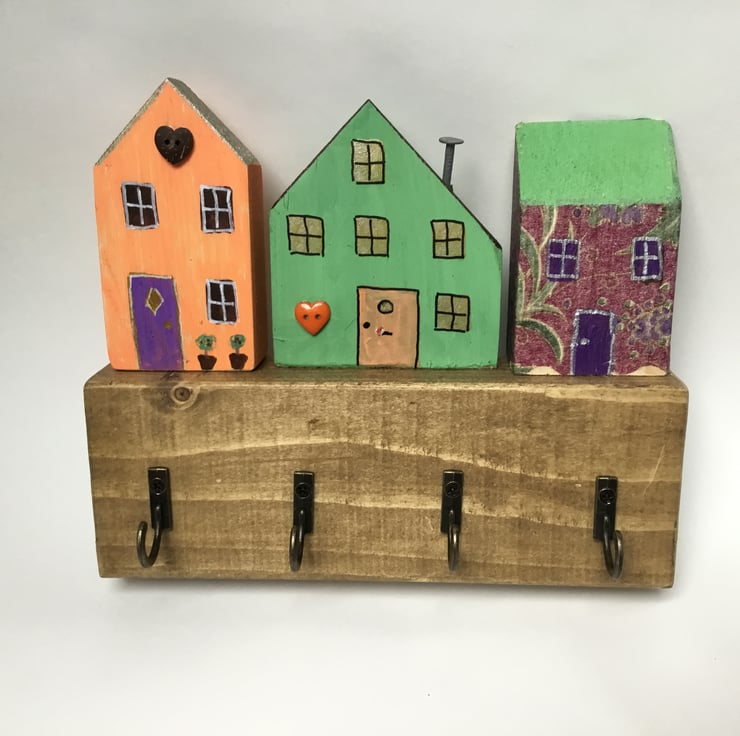 We have been making little wooden house Christmas decorations. They seemed too cute to only come out during the festive period and so the key hanger was born.