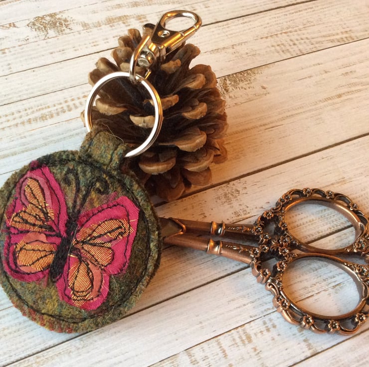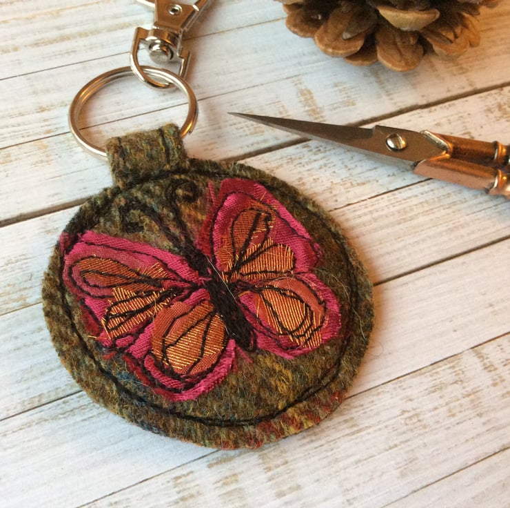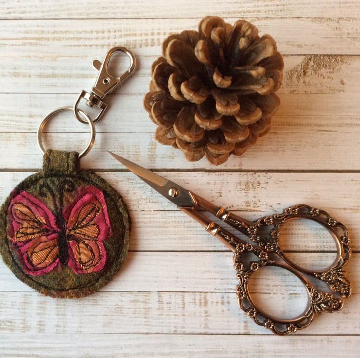 This circular up-cycled wool plaid keyring has an embroidered silk butterfly on it. It measures 6cm x 5.5cm approx. With the split ring the length is 8cm. With the clip the length is 11cm. The charm clip can be removed if you want it shorter.