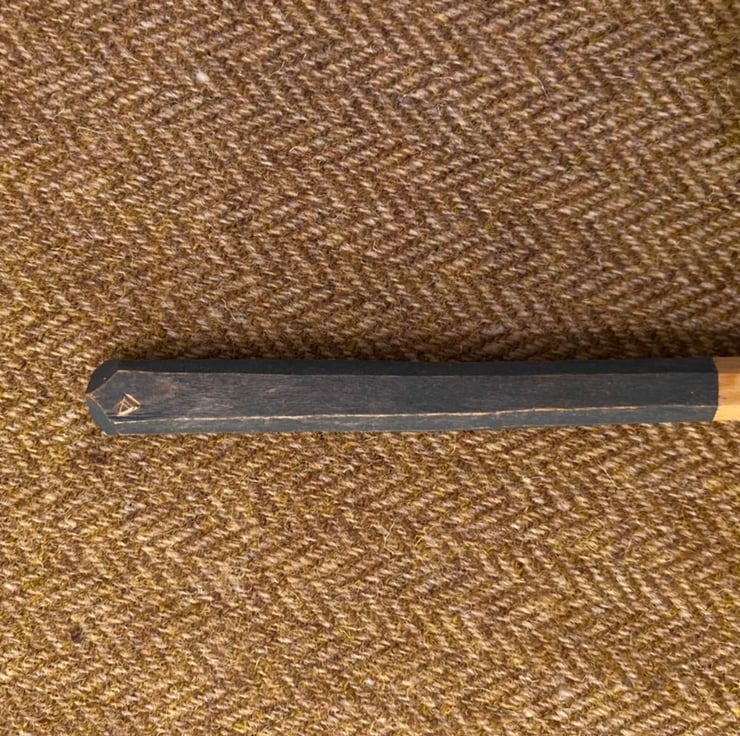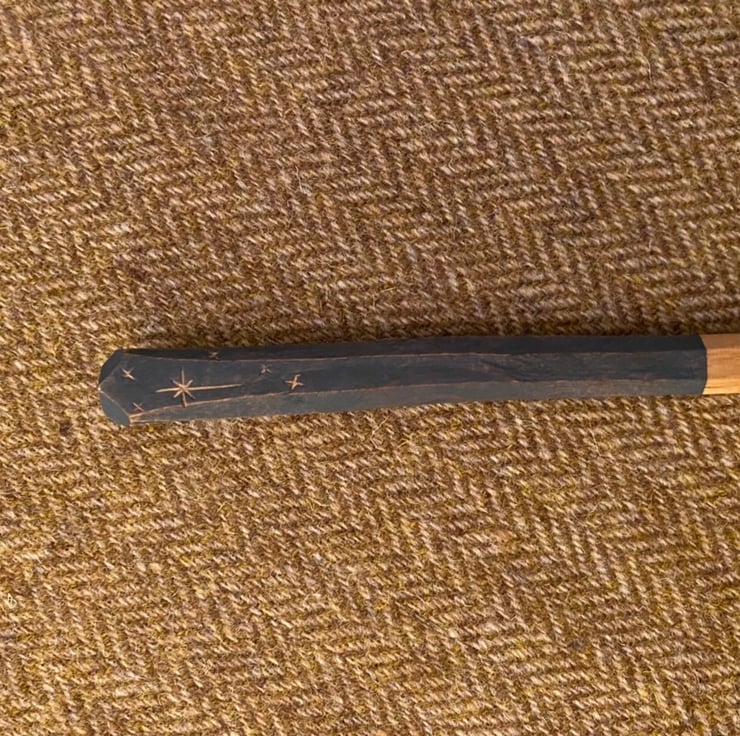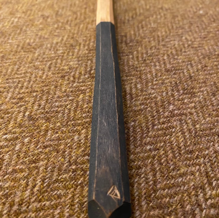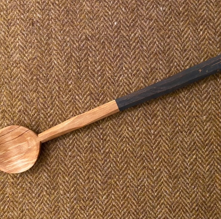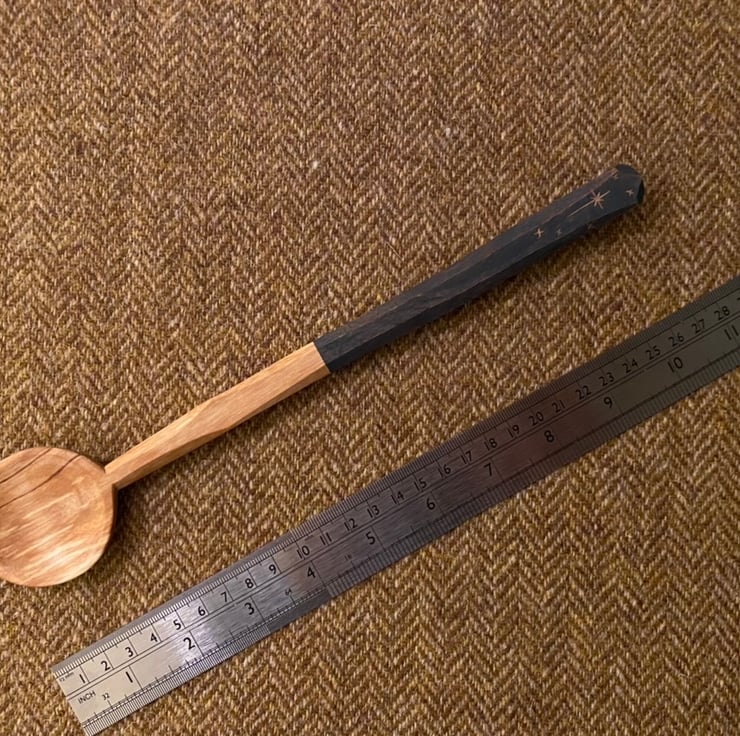 This spoon has been made using traditional methods splitting the material out from a fresh sawn log, sourced from a local tree surgeon. A rough shape for the spoon is then axed out, before moving onto a variety of knives to hone the shape. Once dry, the spoon has then been given two coats of food-safe milk paint to the handle area, before a christmas star is carved into it, along with my makers mark. The spoon has then been burnished with a scottish pebble and sealed using organic food grade linseed oil.