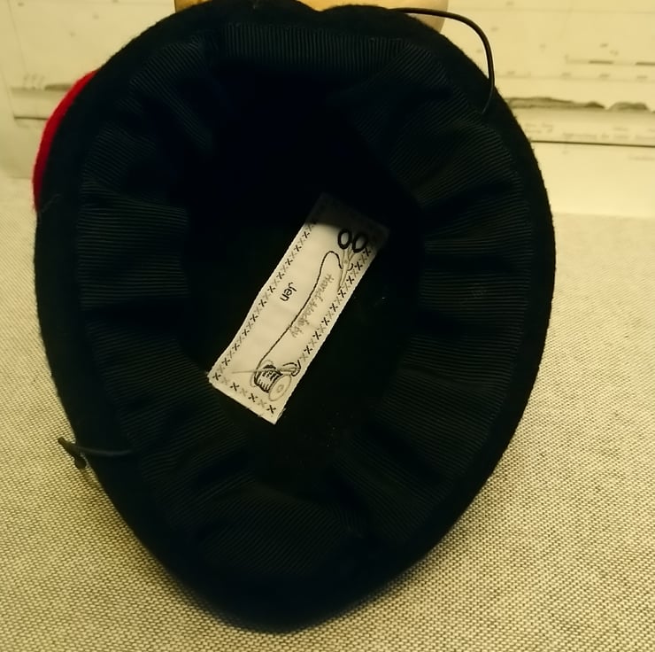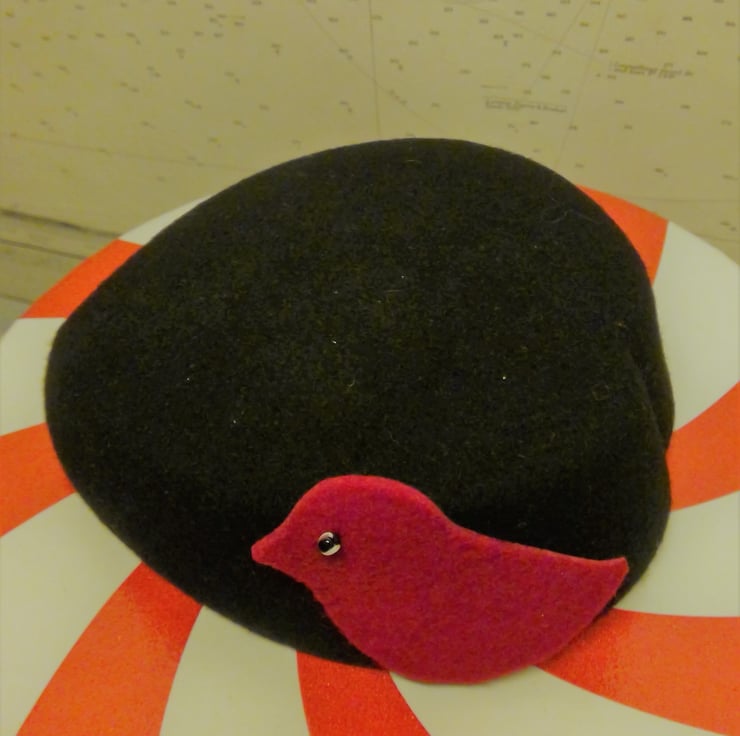 A classic black wool felt pill box with a red wool felt bird with a bead eye for decoration. Classic and quirky. Heart is 6" long, 5" wide, 2" high. The bird measures 3" beak to tail Handblocked , couture made. Unlined. Easy to wear with a hat elastic. Can be worn in variety of ways.
