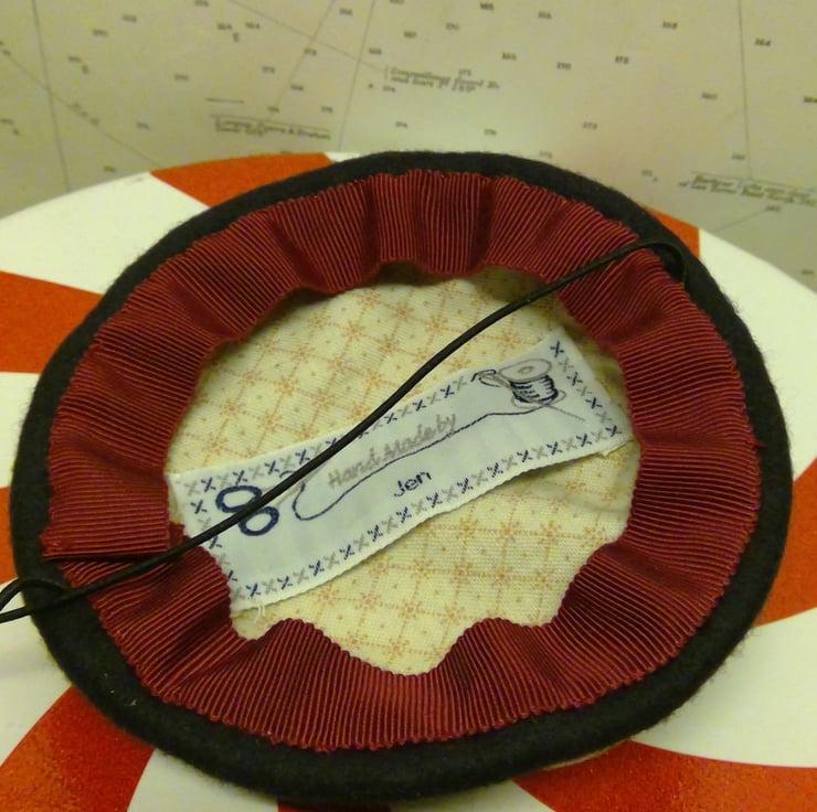 A charcoal grey button wool felt beret handblocked and all handsewn. Couture created grey and maroon leaves highlighted with a vintage cotton button in white and pink. Lined in the same vintage fabric with a hat elastic for easy wearing and styling. Diameter of 4"