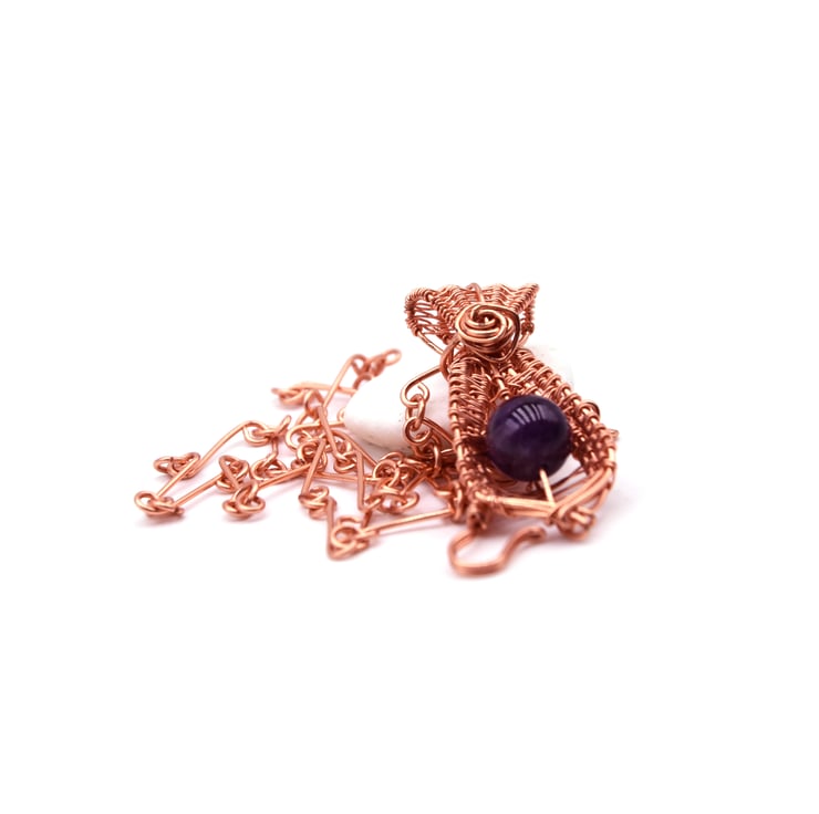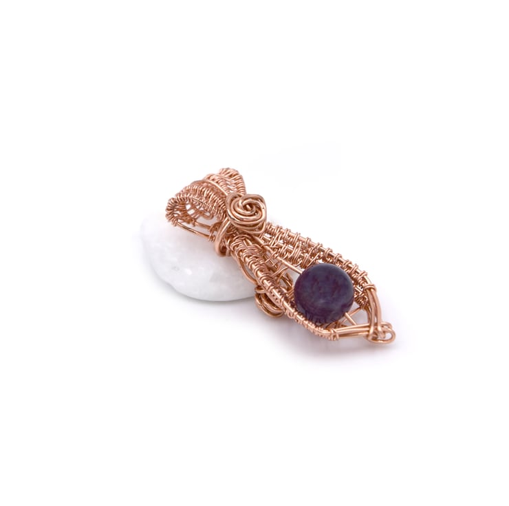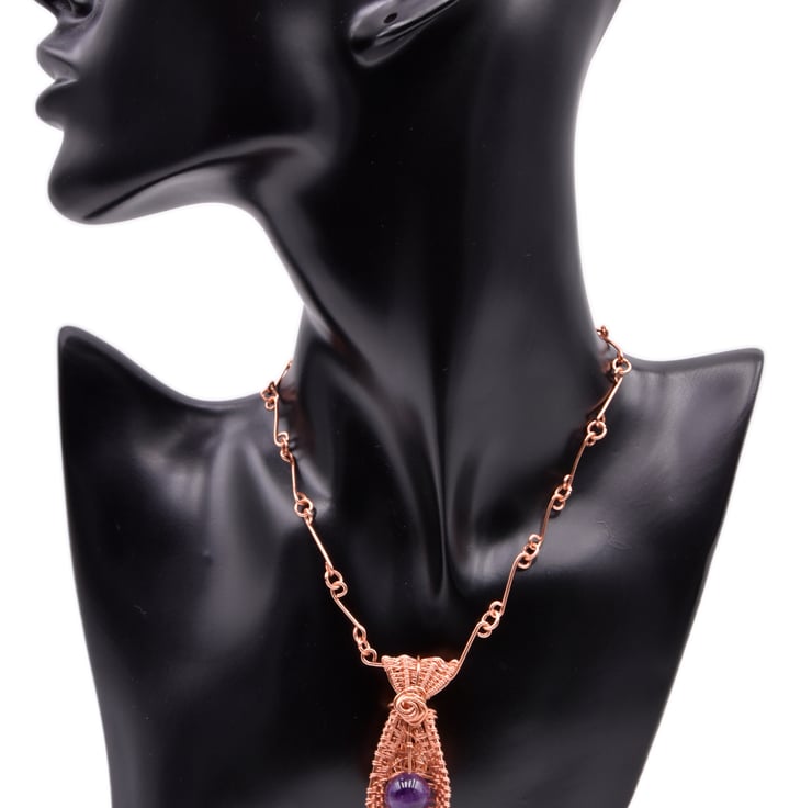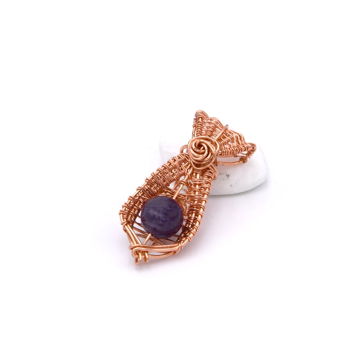 This delicate pendant shaped as a necktie was created around a beautifu dark amethyst bead. The wrapping around the bead creates a tie-like motif, giving this pendant a unique look and feel.