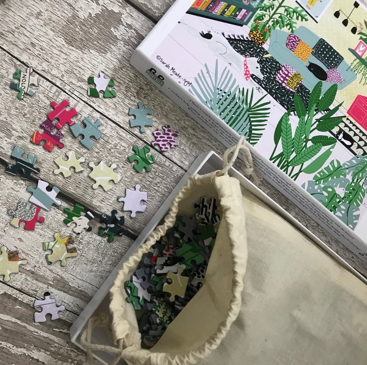 Your jigsaw puzzle is housed in a cloth bag inside the box (no plastic here!)