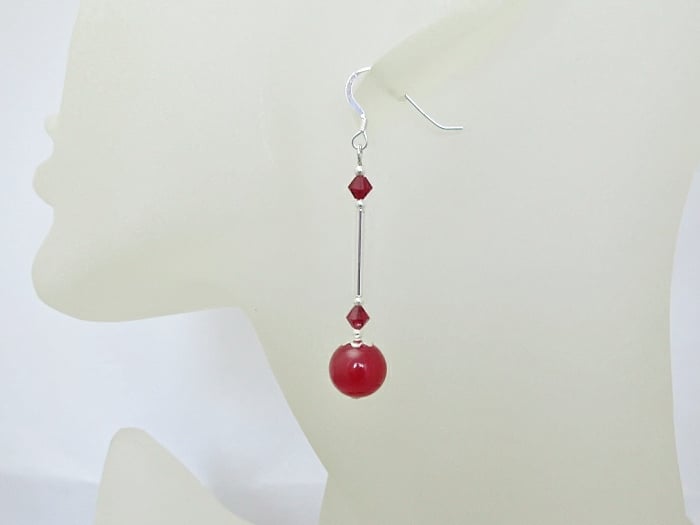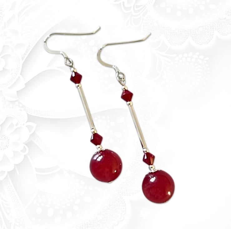 Rich dark red Jade 10mm round semi precious gemstones adorn these 2" long handmade dangly earrings.