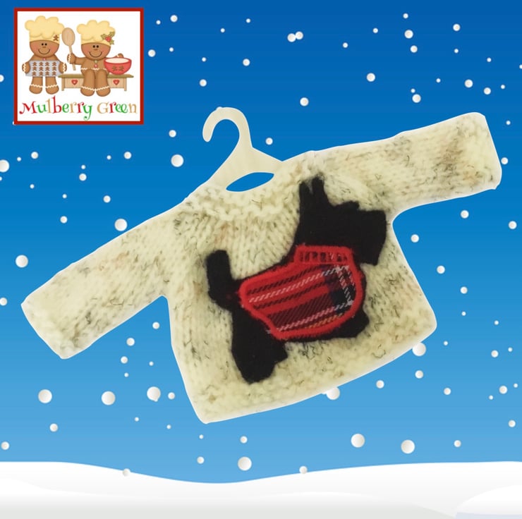 A lovely little Winter white flecked jumper, embroidered with a cute little Scottie dog in a tartan coat to fit the Mulberry Green characters. The jumper is hand knitted and matches the black and white tartan kilt. It comes on a cute little wooden hanger.