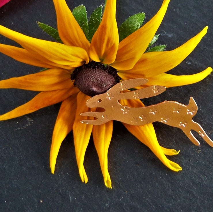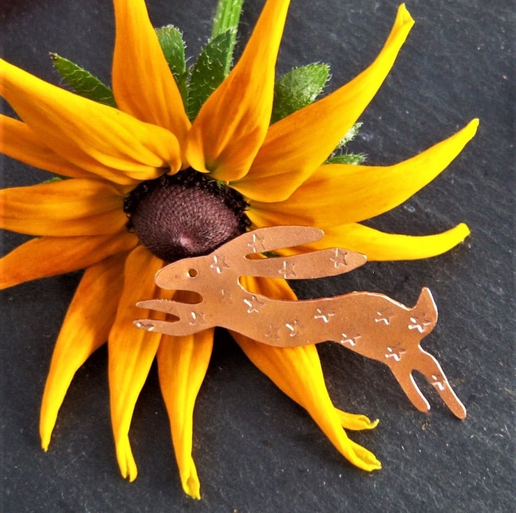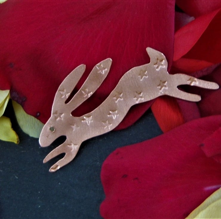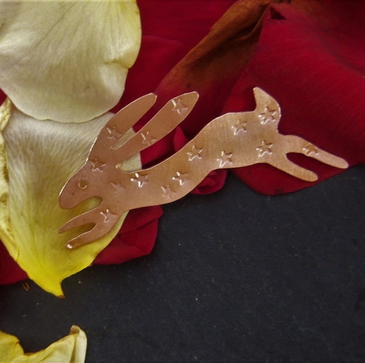 A leaping hare cut from copper sheet and imprinted with random stars. Sterling silver fastener. Approximately 5.5 cms long, end of nose to the tip of the toe.